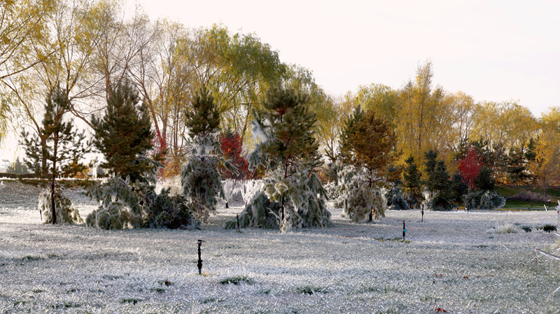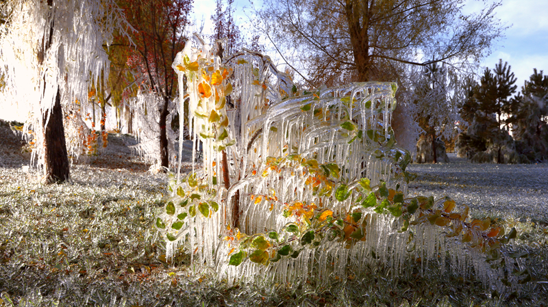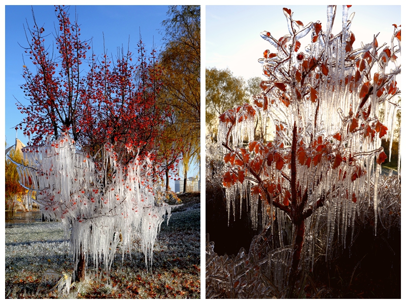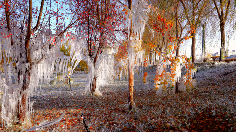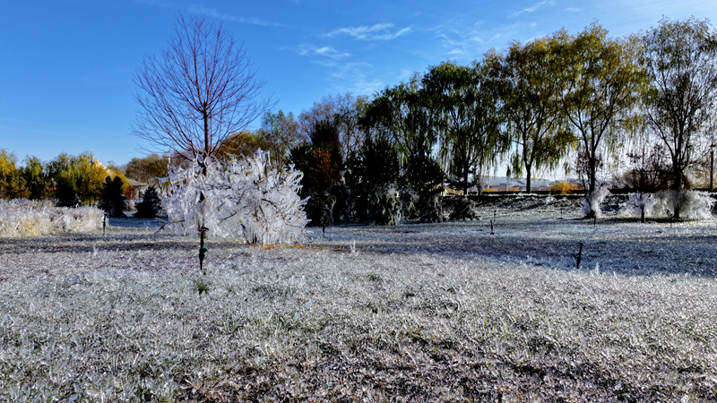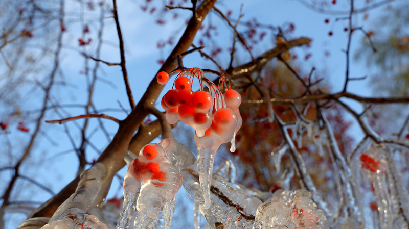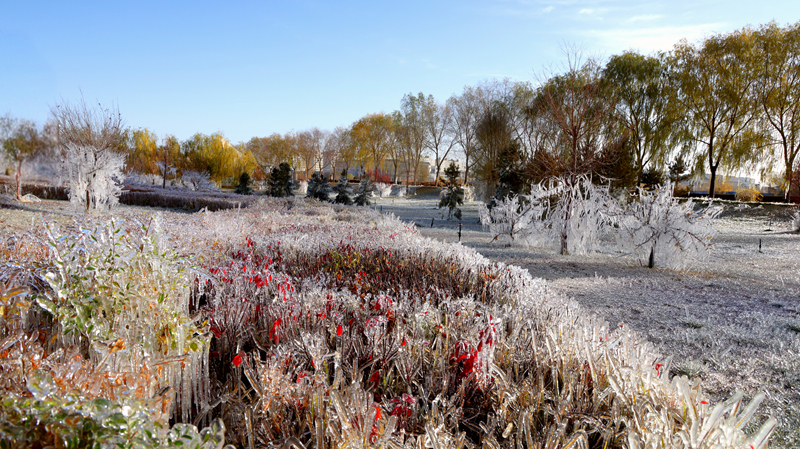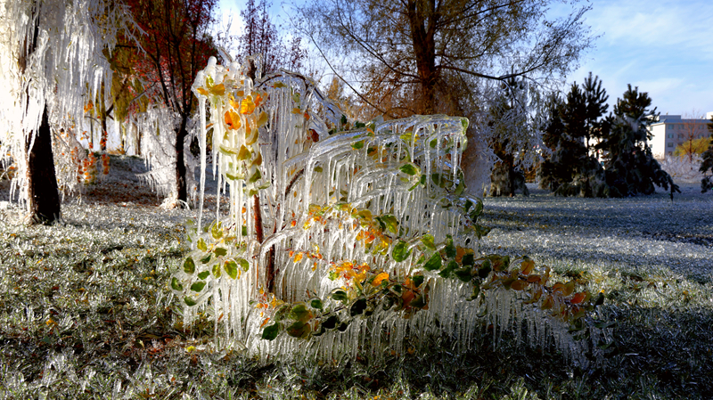 立冬刚过,随着气温降低,记者在临泽县城区多条主干道看到,绿化带进行冬季喷灌的水滴在低温中迅速凝结,有的冰挂形似钟乳石,自叶尖垂落,形成一串串精致的“水晶帘”;有的则如琥珀般,将尚未凋零的绿叶或红果凝固其中,保留了生命最后一抹鲜艳的色彩;更有那低矮的灌木丛,被冰层整体覆盖,轮廓圆润流畅,宛如一件件精心雕琢的玻璃艺术品,与周围城市景观形成了鲜明而奇幻的对比,引得行人纷纷驻足,惊叹连连。(程莉 田育明)