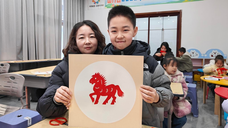 在随后的剪纸课上,省级非物质文化遗产传承人周玉梅为职工和孩子们讲解了剪纸的历史渊源,并演示了线条处理与细节把握的技巧。她手把手指导大家从折叠红纸开始,逐步剪出活灵活现的小马图案。孩子们专注投入,不时互相展示作品,现场洋溢着欢声笑语。