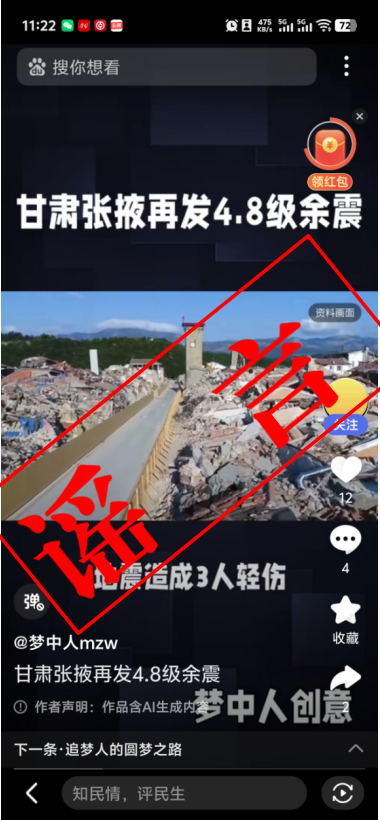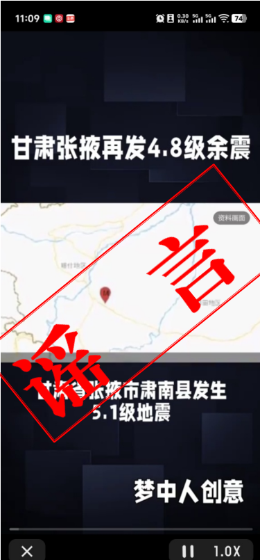 近期,有网民在“百度”“抖音”“小红书”等网络平台发布信息称:“2026年1月26日7时45分甘肃省张掖市肃南县发生5.1级地震”“甘肃张掖再发4.8级余震”。经核实,视频中所显示震中地理位置位于新疆喀什、和田地区,所呈现的季节特征也与张掖市本季节景色严重不符。截至当前,中国地震台网中心未查询到张掖市辖区发生本次地震的相关记录,张掖市地震局、张掖地震监测中心站未监测到任何可能引发破坏性地震的前兆异常信号,也未发布任何地震预警、预报信息,因此,该网民发布的信息确认为不实信息。