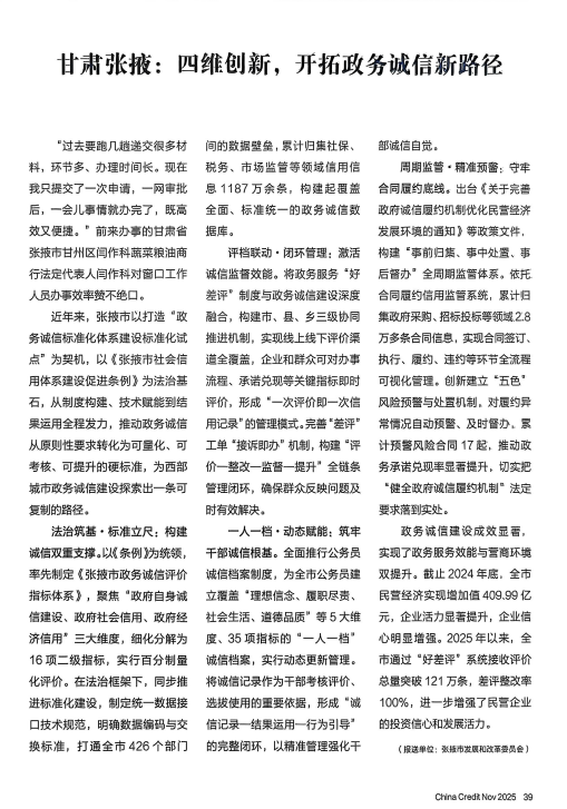 近日,中国发展改革报社发布2025年“信用中国·城市在行动”地方政务诚信典型案例,张掖市发展和改革委员会报送的《甘肃张掖:四维创新,开拓政务诚信新路径》案例成功入选。这一荣誉标志着张掖市在政务诚信建设方面的创新实践获得了国家层面的认可。