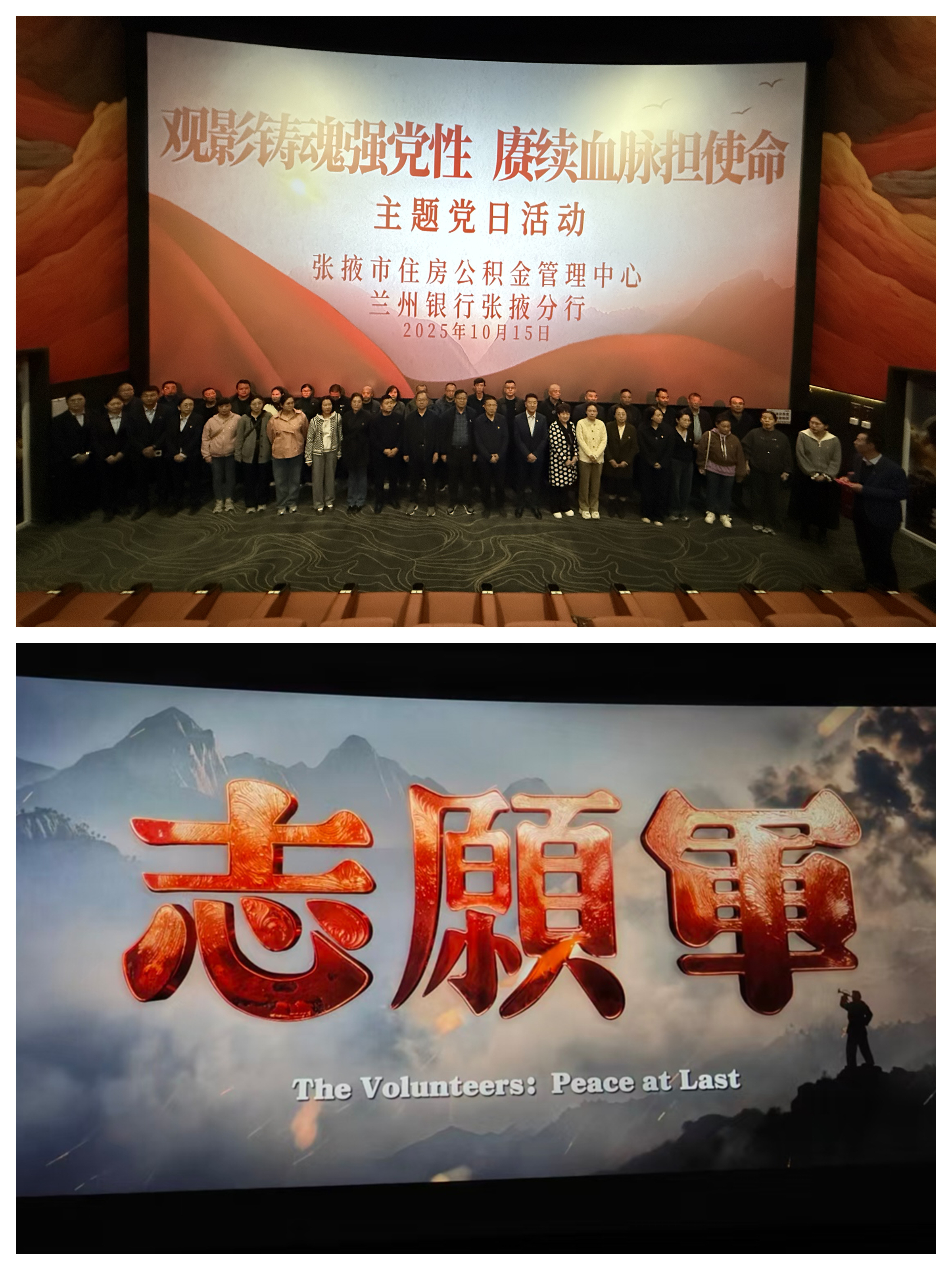 10月15日下午,市住房公积金管理中心组织机关、市直、甘州管理部党员与兰州银行张掖分行联合开展了“观影铸魂强党性·赓续血脉担使命”主题党日活动,集中观看了爱国主义题材电影《志愿军:浴血和平》,在光影中重温峥嵘岁月,在历史中汲取奋进力量。