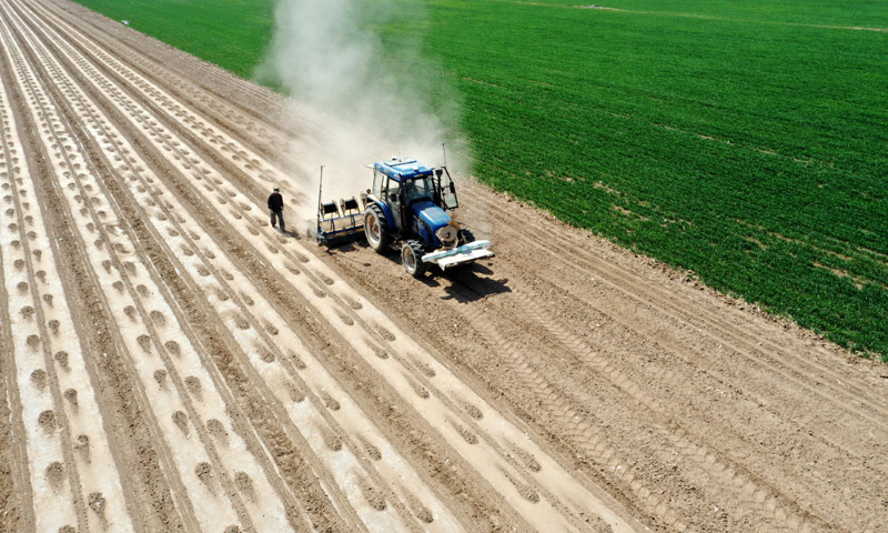 在新疆生产建设兵团第六师共青团农场,一台安装北斗导航自动驾驶系统的播种机在播种棉花(2020年4月8日摄,无人机照片)。新华社发(李华北 摄)