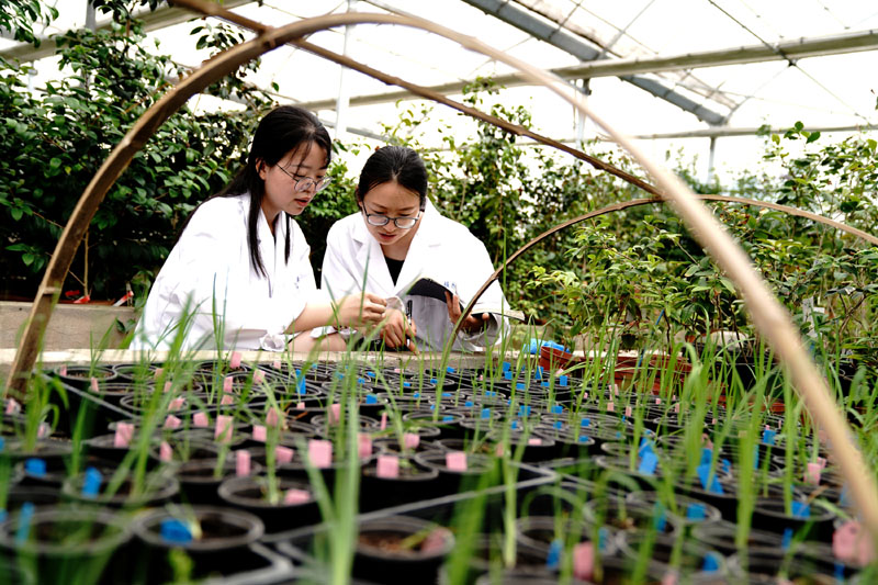 上海植物园科研人员程琳(左)、张蕾蕾在温室观察记录花菖蒲新品种生长情况(2020年6月5日摄)。新华社记者 张建松 摄