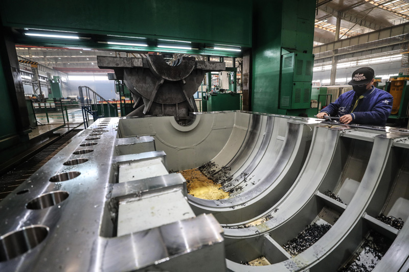 沈阳鼓风机集团股份有限公司的工人在车间进行生产工作(2020年2月10日摄)。新华社记者 潘昱龙 摄