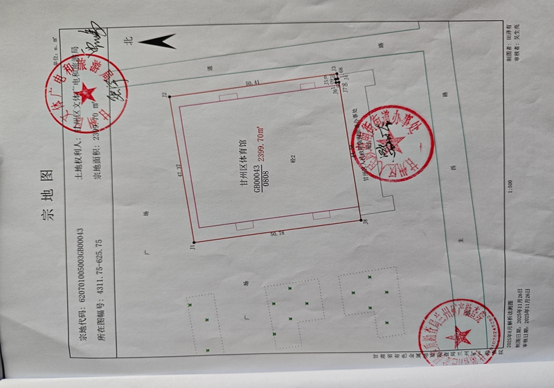 宗地二:位于甘州区县府街212号,宗地面积2399.7平方米,未办理土地手续,规划及实际用途为体育用地,权利人为甘州区文体广电和旅游局,使用权类型为划拨。