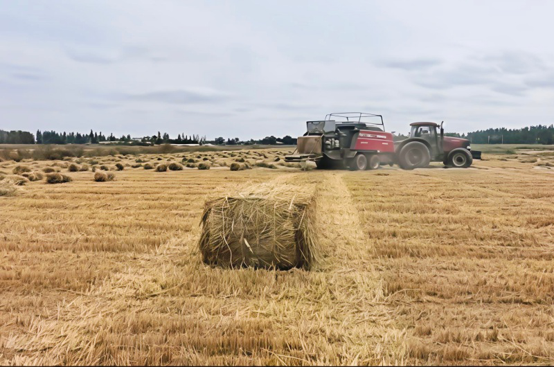 清晨的甘州区乌江镇稻米生产基地中,数台稻草打捆机连续不断,“嗒嗒”作响,它们大口吞噬着蓬松散落、铺陈遍地的稻米秸秆,不过转瞬,金黄色的秸秆便被挤压转化,变成规则统一、方正紧密、尺寸精准的长捆,以往田间常见稻谷收割后升腾的燃烧浓烟景象,在甘州区乌江镇富饶田野间已成历史。