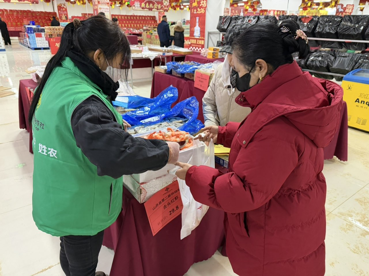 现场购销氛围热烈,工作人员身着绿色马甲,坚守服务一线,为前来采购的群众细心打包、耐心答疑。在生鲜水产展区,“去头红虾 社员价29.8”的价签醒目亮眼,工作人员正将新鲜的红虾装入购物袋,群众手持商品仔细挑选,脸上洋溢着置办年货的喜悦。本届年货节在首届成功举办的基础上提质升级,依托“工贸云仓”资源优势,汇聚粮油副食、生鲜水产、特色农产、日用百货、新春礼盒等12大类1000余种商品,从源头直供保障品质,以平价销售让利于民,切实解决群众“年货采购难、选择少、价格高”的问题。
