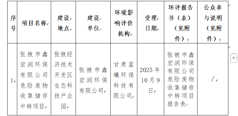关于张掖市鑫宏润环保有限公司危险废物收集储存中转项目评价文件受理情况的公示