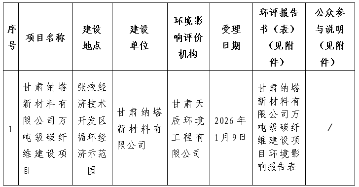 根据建设项目环境影响评价审批程序的有关规定,我局受理1个建设项目环境影响评价文件,现将受理情况予以公示,公示期为2026年1月9日-2026年1月13日(3个工作日)。
