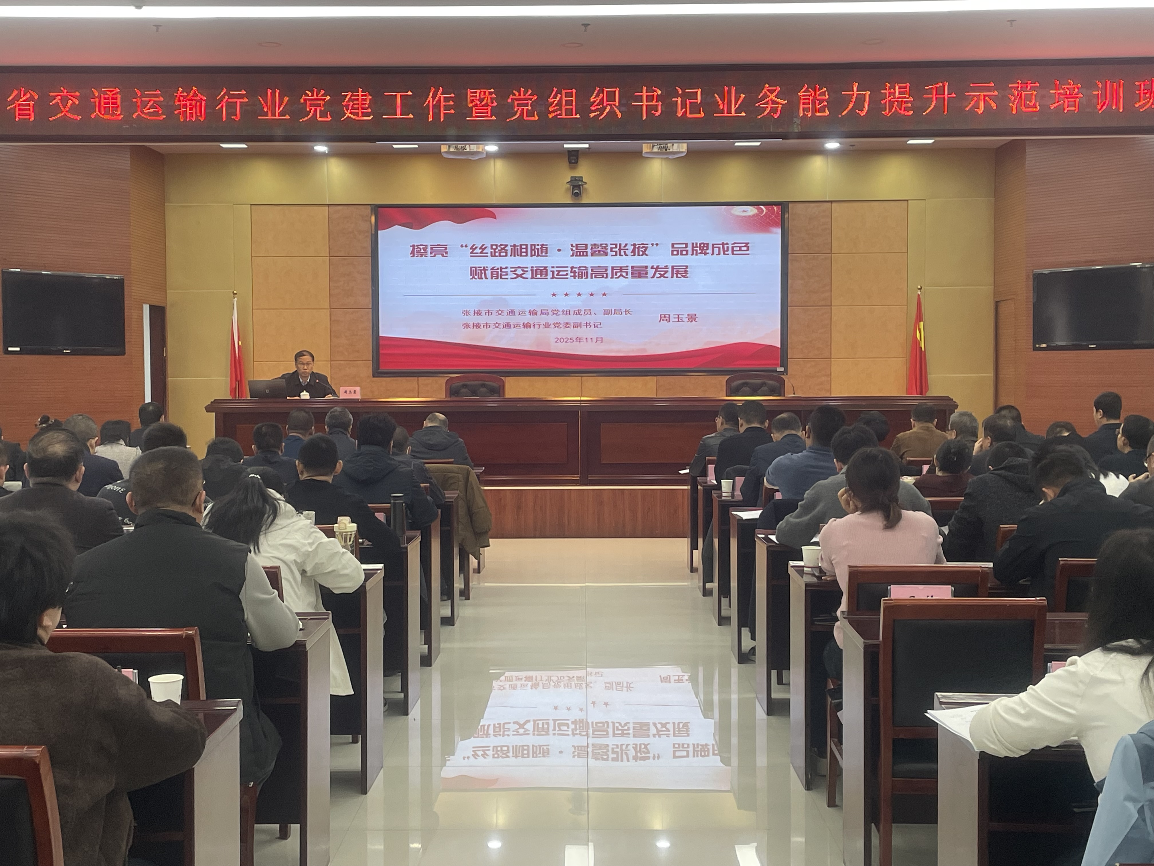 11月11日至11月14日,甘肃省交通运输行业党委举办全省交通运输行业党建工作暨党组织书记业务能力提升示范培训班。培训期间,张掖市交通运输行业党委副书记以“擦亮‘丝路相随·温馨张掖’品牌成色 赋能交通运输高质量发展”为题,向全省120余名参训学员系统介绍了张掖市交通运输行业党建赋能行业发展的经验做法和成效,获得了参训学员的一致好评。