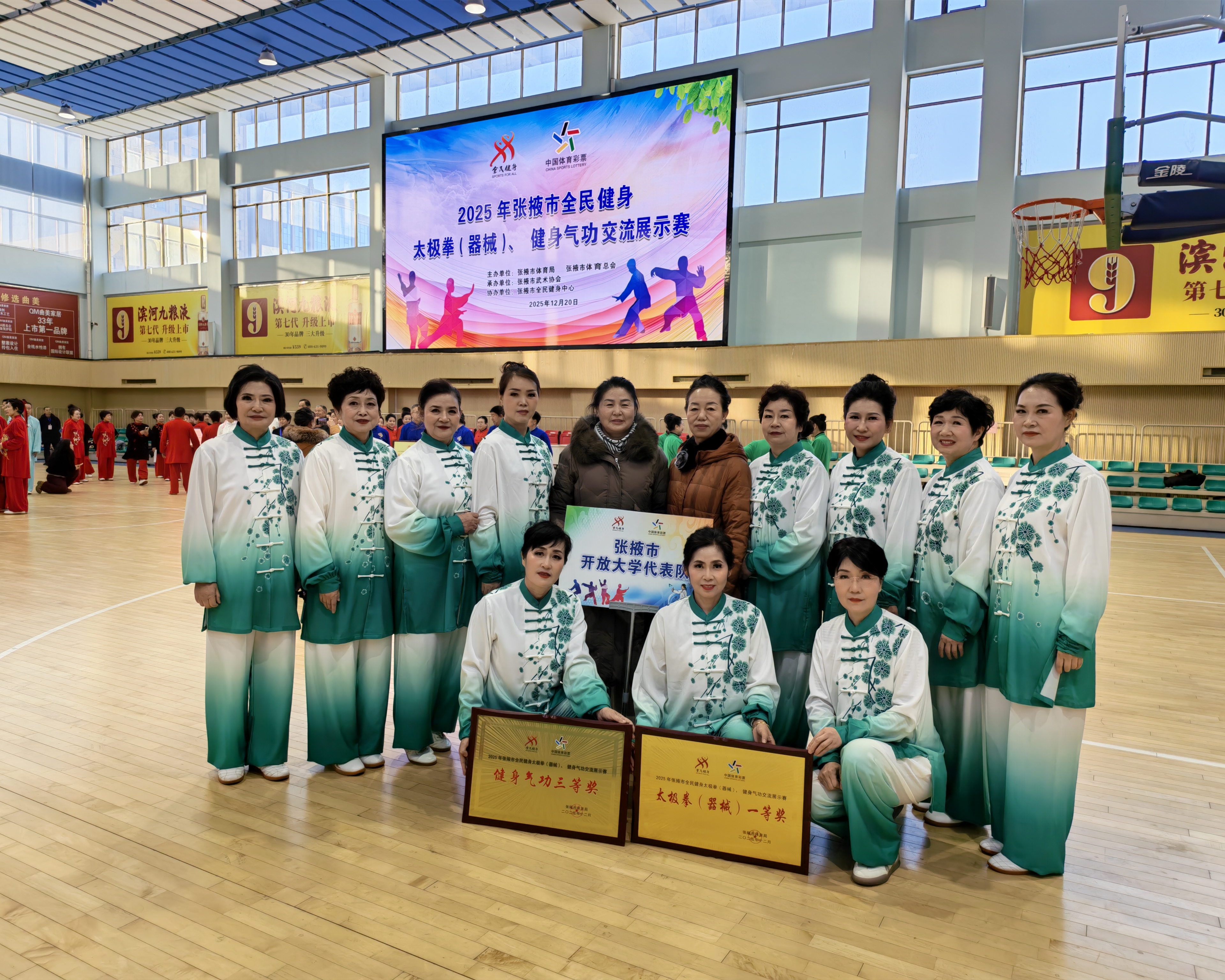 日前,在市体育局组织举办的2025年张掖市全民健身太极拳(器械)、健身气功交流展示赛上,张掖开放大学社区教育太极拳班代表队分别获得太极拳(器械)一等奖和健身气功三等奖。