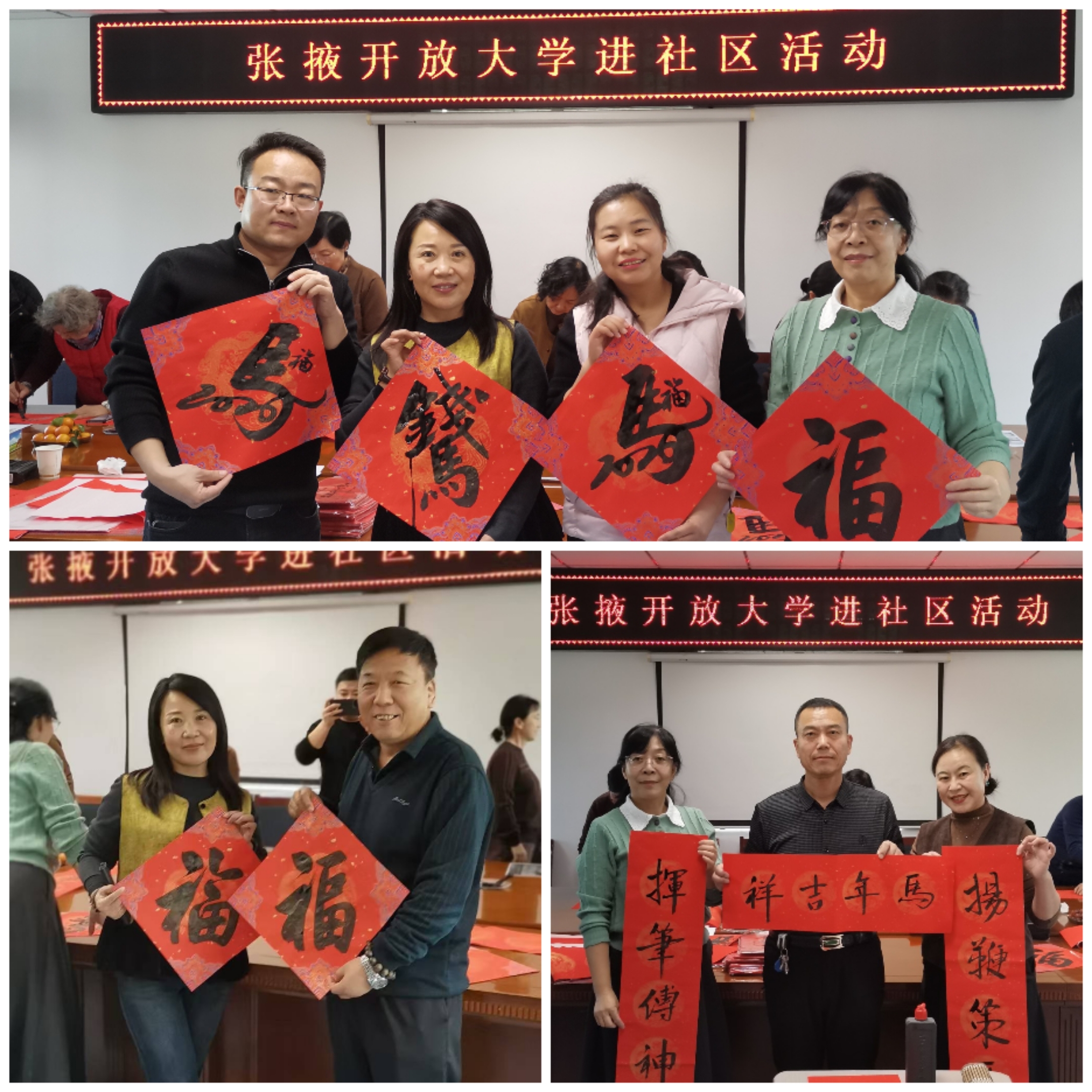 活动现场翰墨飘香、暖意融融,师生与社区书法爱好者共同执笔,“龙马精神添福寿 春风得意启新程”“马跃前程财运旺 春回大地福临门”等一幅幅寓意吉祥、对仗工整的春联跃然纸上,大红“福”字红遍现场。社区工作人员和志愿者协助分发,并为行动不便的老人上门送“福”。