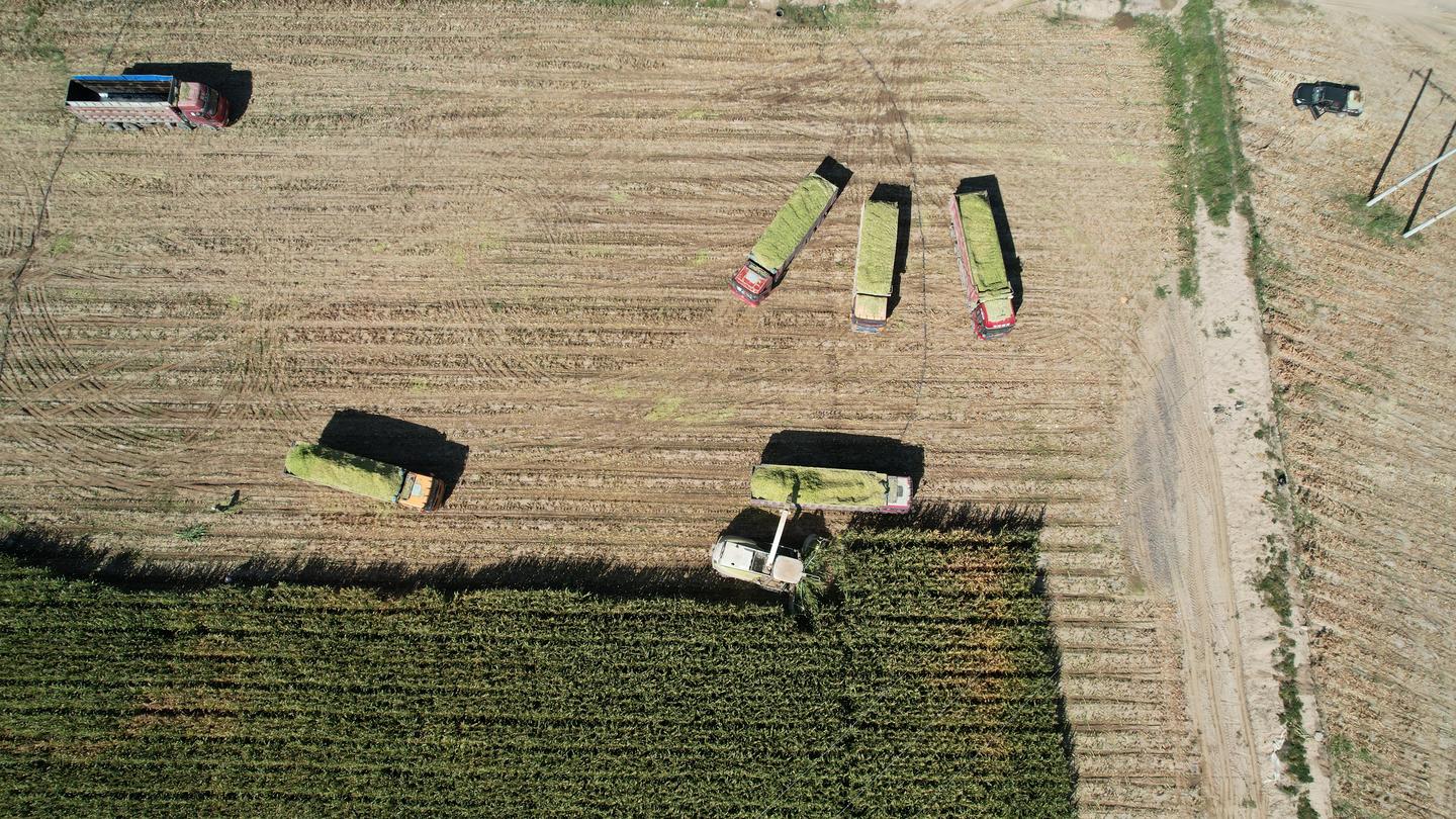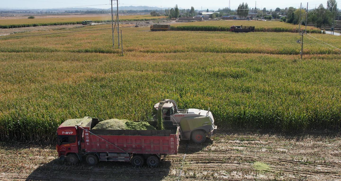 山丹农场甜菜丰收只是我县大力推广浅埋滴灌技术的一个缩影。同样,在位奇镇十里堡村的高效节水灌溉农田里,成片的青贮玉米颗颗饱满,大型收割机在田间来回穿梭,一株株青贮玉米连茎带穗被卷入机器,经过切碎和揉搓,变成青贮饲料从排料口撒出,被跟随的配套作业运输车装进车箱,田间地头一派喜人的收获景象。