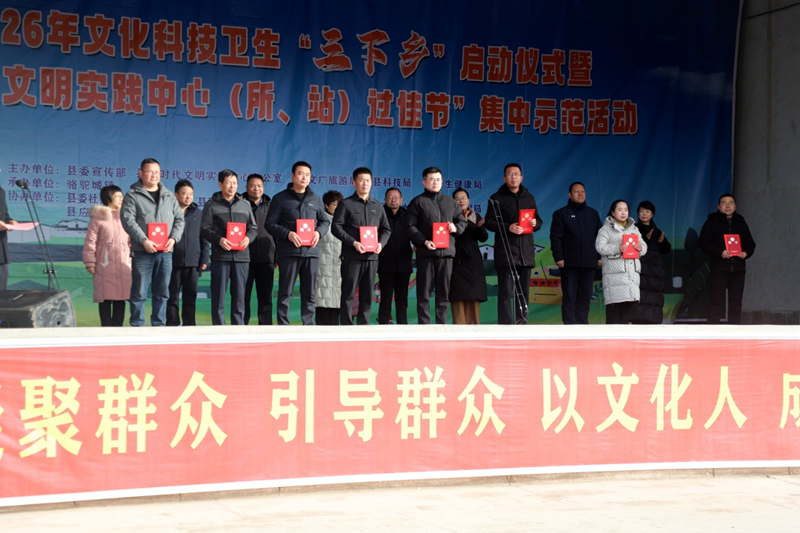 1月26日,高台县2026年文化科技卫生“三下乡”启动仪式暨“我在新时代文明实践中心过佳节”集中示范活动在骆驼城镇全面启动。县科技局组织科技志愿者开展科技科普宣传服务,把政策红利、法律知识和实用技术精准送到群众家门口。