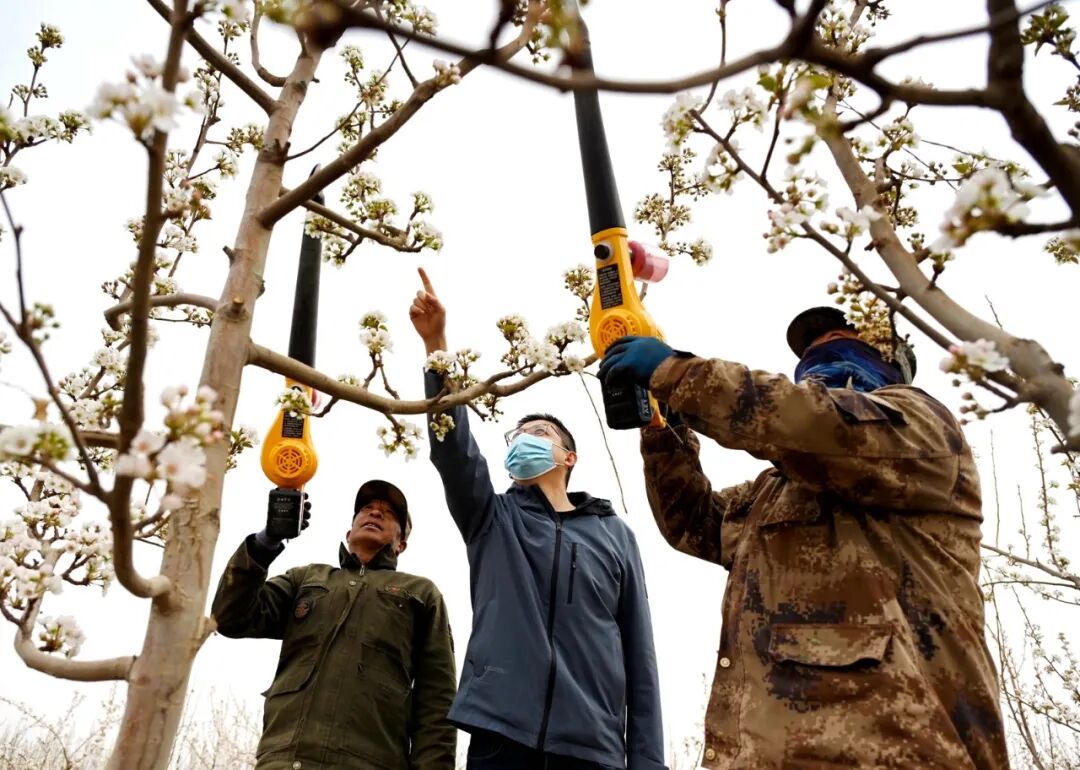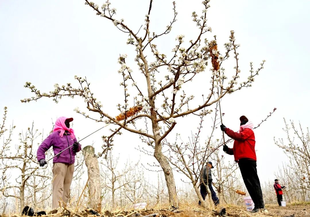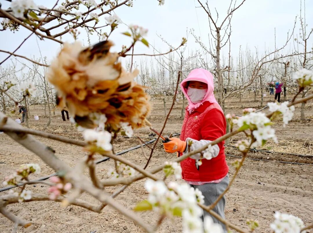 “梨树这种异花果树需要靠风或者蜜蜂来传粉。不过,天气一变化,花就很容易谢,只有3-4天的黄金时机,一不小心就错过了。所以,我们得用人工抖粉的方法来帮忙授粉,这样能提高成功率,让梨坐果更多、更整齐,减少畸形果。”梨园主管陈吉贵介绍。