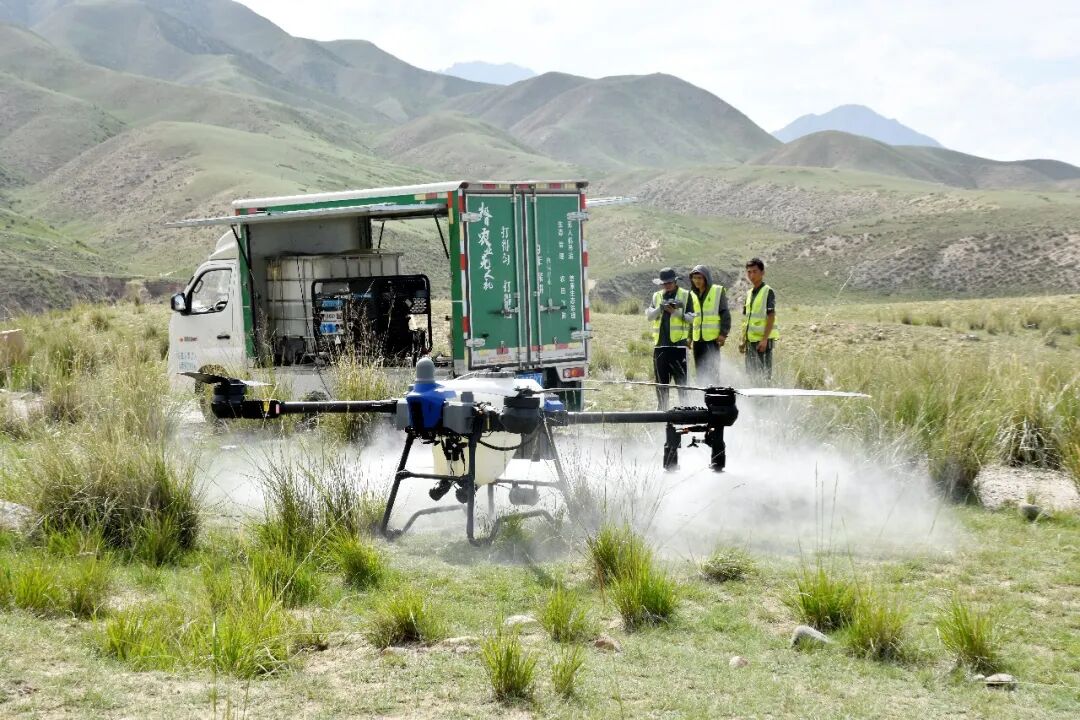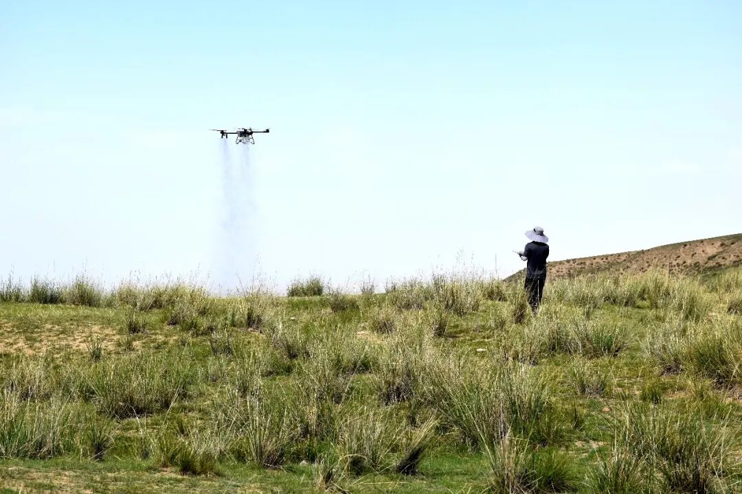 这一转变源于高台县在退化草原修复中采用的“空中+地面”协同作业模式,大型拖拉机发挥效率高、施肥施药量大的优势,牵引撒肥机和施药机在平坦区域撒施有机肥、喷洒农药;无人机则挂载肥料或农药,灵活穿梭于陡坡沟壑,精准投送至地面机械难以覆盖的区域。地面机械主攻“面”,无人机填补“点”,这种“空地互补”模式实现草原改良全覆盖,成为今年高台县三北工程林草湿荒一体化保护修复和草原植被恢复费项目实施的标配,为草原生态快速恢复赢得宝贵时间。全县全年完成退化草原修复治理29万亩、防治鼠虫害15万亩。