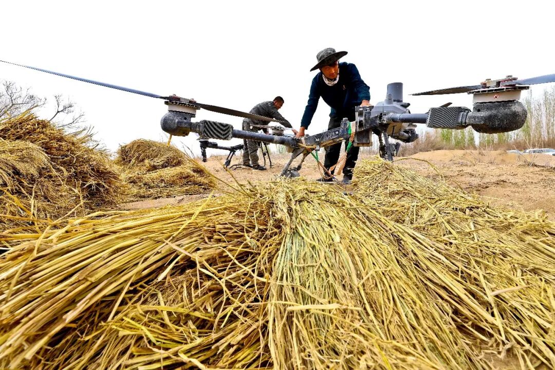 针对沙漠腹地车辆难入、传统运输效率低下的痛点,高台县在三北工程固沙项目中大力推广“无人机吊运稻草”技术。通过GPS定位系统,无人机实现“点对点”精准投放,单次飞行覆盖2公里范围,日均投送稻草10吨,草方格铺设效率提升3倍。昔日施工人员肩扛人背、单日作业不足2亩的困境,如今60余人的标段日压沙面积可达150-200亩。今年,高台县在黑泉镇西沙窝和罗城镇盐池滩完成固沙压沙2.79万亩,昔日“沙进人退”的荒漠戈壁,如今正借助科技力量实现治沙工程的“加速度”。