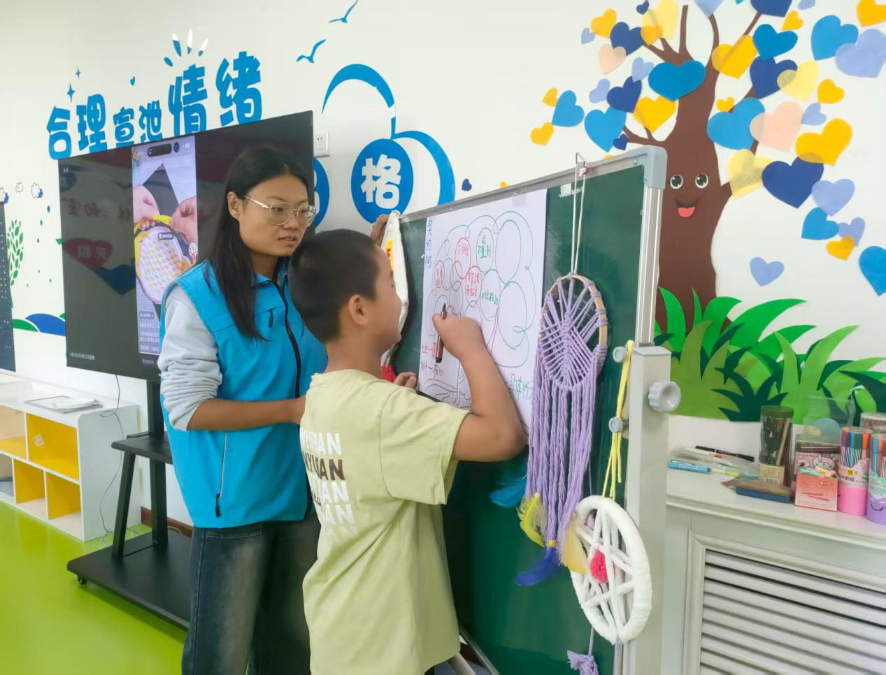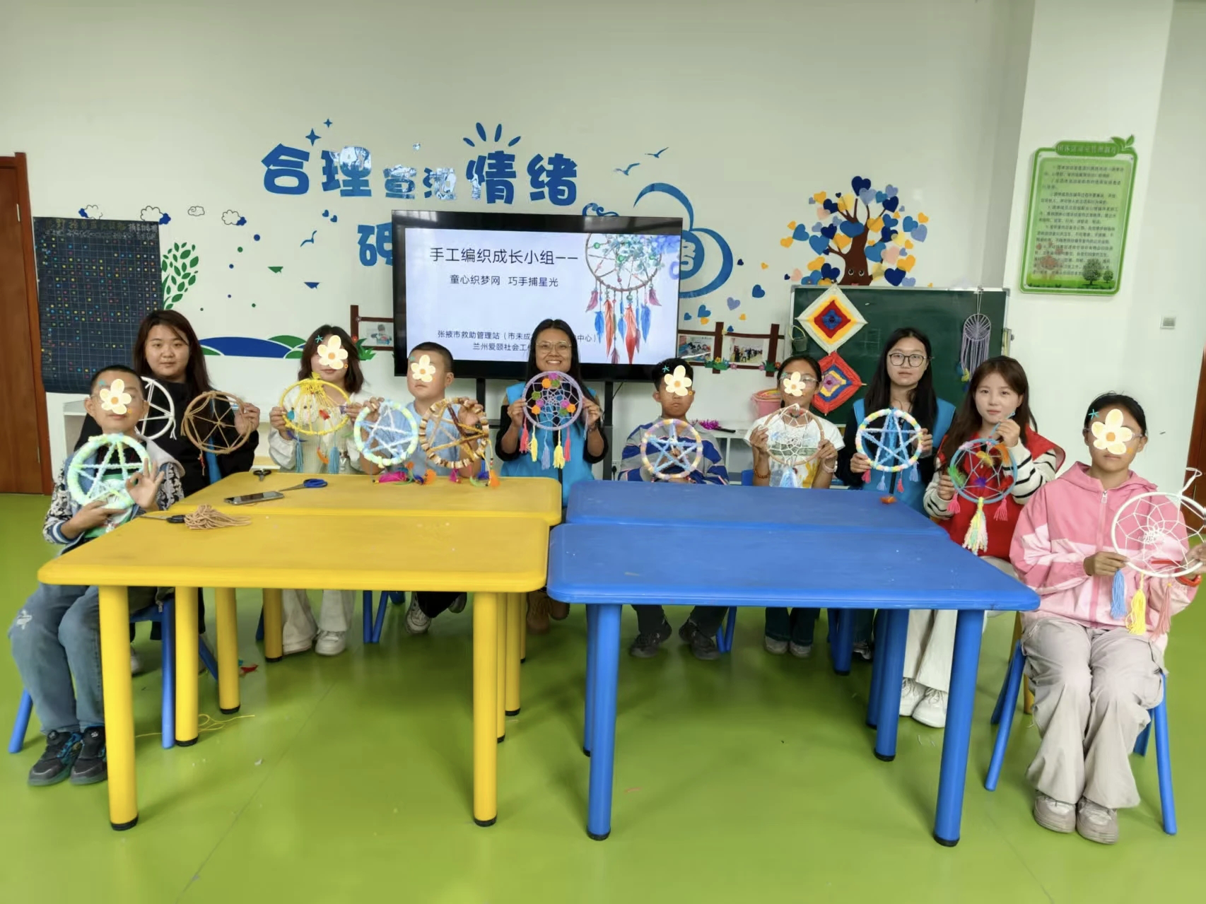 编织美梦,以 “网寄望。本节活动聚焦未来展望与离别情绪调适。驻站社工通过向孩子们讲述“捕梦网”的美丽传说,鼓励孩子们亲手制作属于自己的梦网,寄托对未来的憧憬。孩子们融合前两节所学,运用毛线与扭扭棒进行装饰,完成了一件件富有象征意义的综合手工作品。随后的“成长展览”上,孩子们化身“小导览员”,自豪介绍自己的创作系列,共同回顾小组历程,强化积极改变。