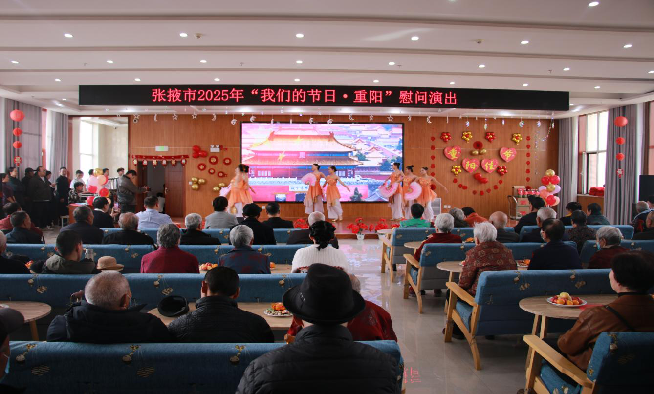 重阳节主题活动在甘州区彩虹丝路演艺有限责任公司带来的舞蹈《万紫千红》中拉开帷幕。室内洋溢着欢声笑语,老人们品尝着工作人员精心准备的水果点心,欣赏着精彩节目,不时发出声声喝彩,脸上洋溢着幸福的笑意。随后,器乐朗诵与独唱轮番登场,悠扬的旋律与深情的歌声交织,传递着对岁月的敬意和对老人们的美好祝福。张掖市文化馆合唱团、管乐团带来的合唱、器乐合奏节目精彩纷呈,醇厚的歌声与恢弘的乐声赢得了老人们阵阵热烈的掌声。张掖市七一演艺集团带来的秦腔表演韵味十足,熟悉的唱腔和精湛的演绎勾起了许多老人的美好回忆,现场喝彩声此起彼伏。最后,张掖市文化馆合唱团带来的大合唱《我和我的祖国》为整场演出画上了圆满的句号。