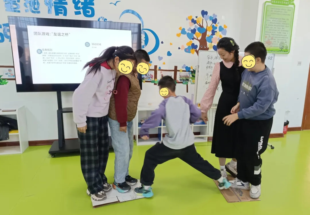 团队游戏:在协作挑战中深化社交理解。“友谊之桥”团队游戏将活动氛围推向高潮,也成为检验孩子们社交技能实践成果的“实战舞台”。游戏中,社工设计了“利用有限‘桥墩’共同渡河”的协作挑战,要求孩子们在有限资源下,通过持续沟通、资源协调、相互支持完成任务。过程中,孩子们主动运用“请求帮助”“真诚鼓励”“分工协作”等社交技巧,或出谋划策规划“渡河路线”,或主动协助同伴搭建“桥墩”,或用暖心话语鼓励身边伙伴,在并肩作战中亲身体验有效沟通对团队成功的重要性,深刻理解“团结就是力量”的内涵,进一步深化了对社交协作的认知与感悟。
