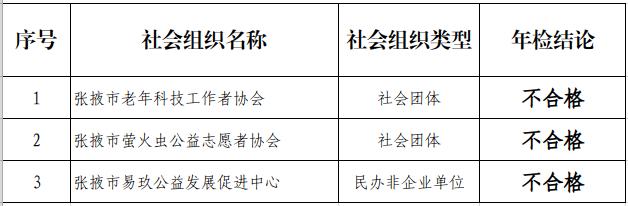 根据《社会团体登记管理条例》《民办非企业单位登记管理暂行条例》《民办非企业单位年度检查办法》等法规、规章及有关规范性文件的规定,对张掖市民政局成立登记的社会团体、民办非企业单位实施2024年度检查。经初步审查,现对社会组织2024年度年检拟定结论予以公示,公示期为7天(2025年9月18日—9月25日),公示期内若对年检结论有异议的请向张掖市民政局社会组织管理局举报或反映。