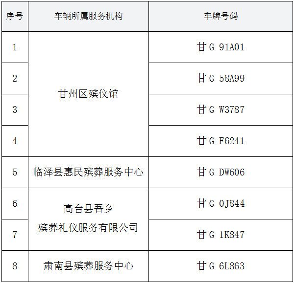 为进一步规范殡葬服务市场秩序,切实加强殡葬服务车辆规范管理,根据《甘肃省殡葬服务车辆管理办法》规定,现将县区登记备案的殡葬服务车辆信息向社会公示,接受社会监督。