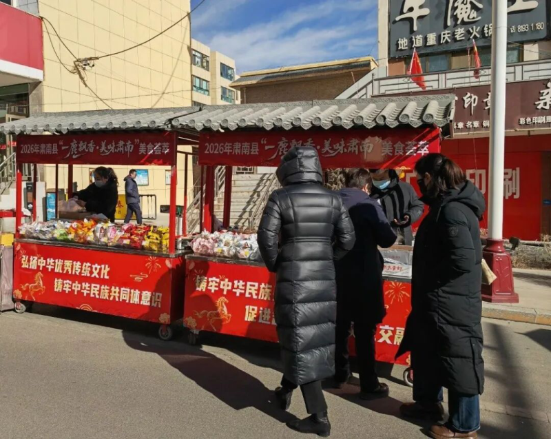 产业共兴,共绘共同富裕同心图。“一鹿优选·甘货到家”年货促销区内,各族农户、企业带来的牛羊肉、奶制品等特色农产品琳琅满目,“品尝体验”“礼盒定制”等贴心活动吸引各族群众驻足选购。线上直播带货同步发力,让肃南特色农产品走出祁连山脉、走向全国各地,既有力助力乡村振兴,更让各族群众在产业链上抱团取暖、携手共赢,深刻体会“各民族共同团结奋斗、共同繁荣发展”的实践价值。“一鹿飘香·美味肃南”美食荟萃活动区里,各民族特色美食集中亮相、香气四溢,商户们相互交流烹饪技艺、共享客源渠道、互帮互助经营,在真诚合作中增进了解、加深情谊。各族群众穿梭其间,品尝特色美食,在味蕾的碰撞中感受中华多元文化的魅力,推动饮食文化在传承中创新、在交融中发展,让产业发展成为凝聚民族力量、促进共同富裕的强大引擎。