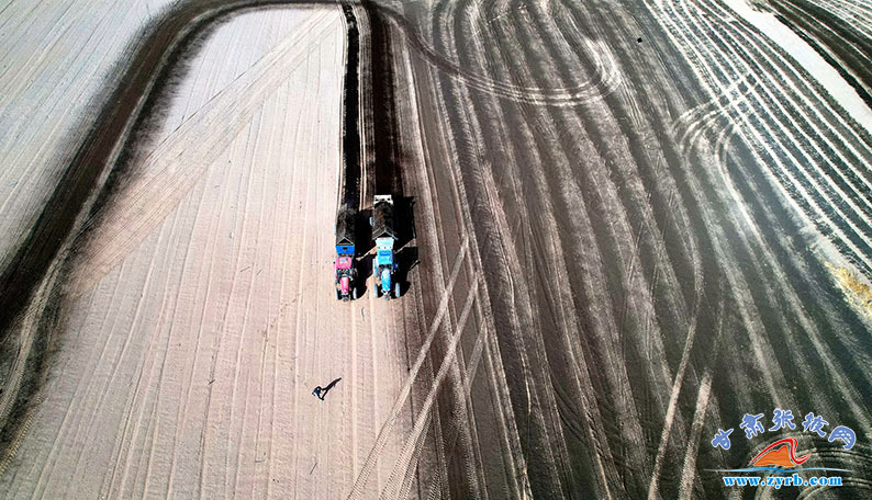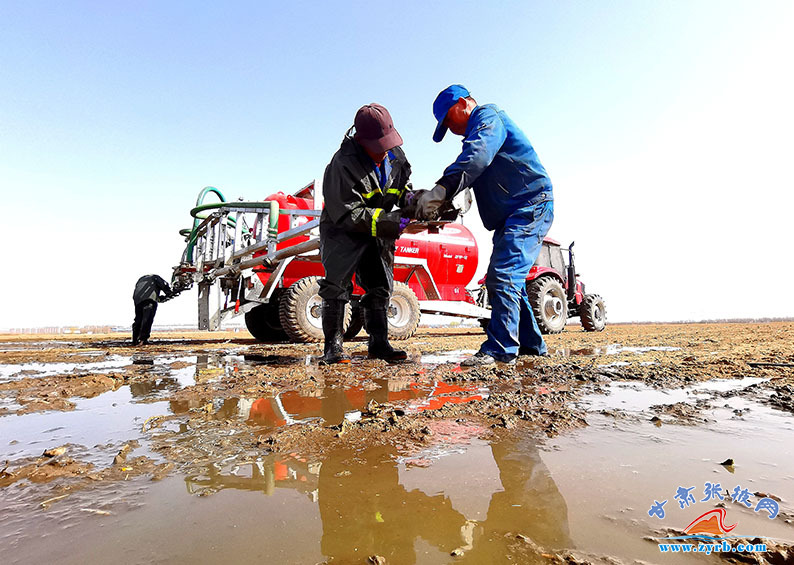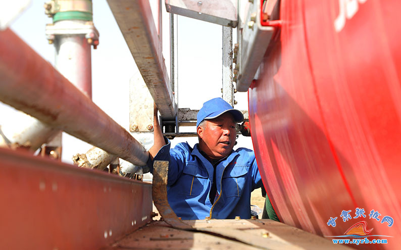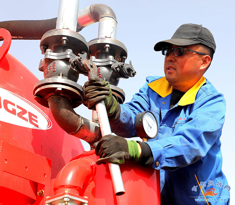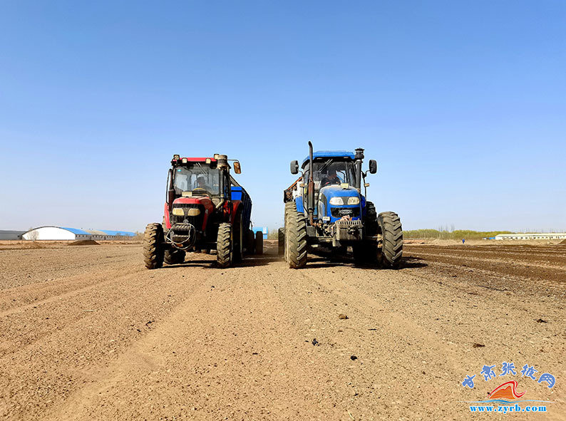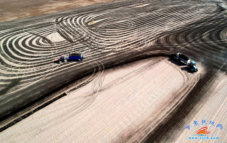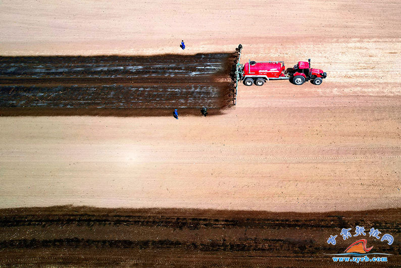 4月10日,在位于民乐县的甘肃华瑞农业股份有限公司千亩苜蓿种植基地上,自动喷灌车在缓缓前行,12个喷头正在紧张有序的喷洒液态地膜。