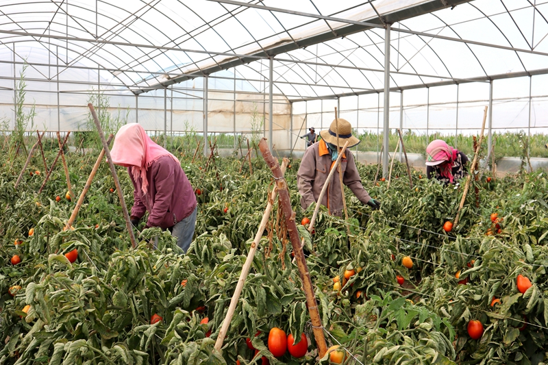 在种植户宋生兵的制种西红柿大棚里,绿叶粉果,一个个色泽红润、硕大饱满的西红柿挂满藤蔓,工人们正忙着挑选采摘成熟的西红柿。