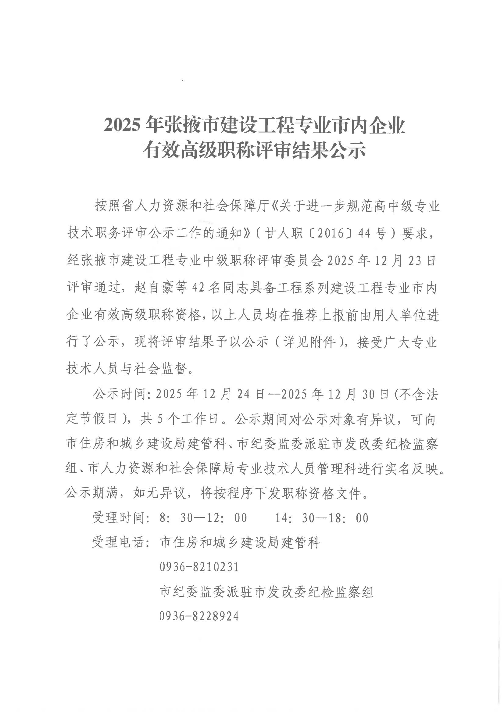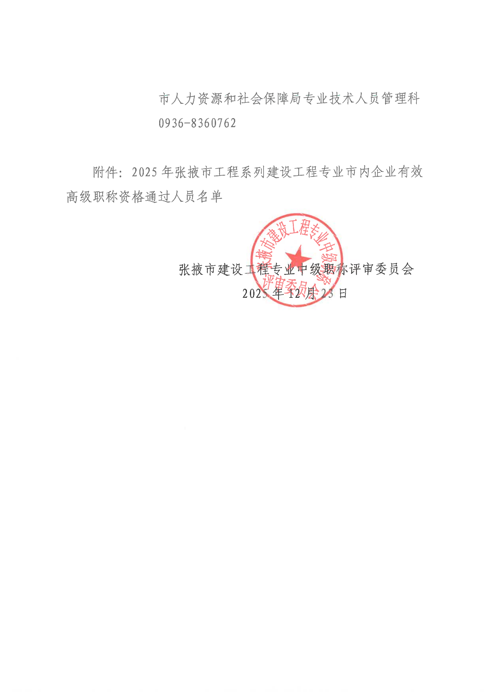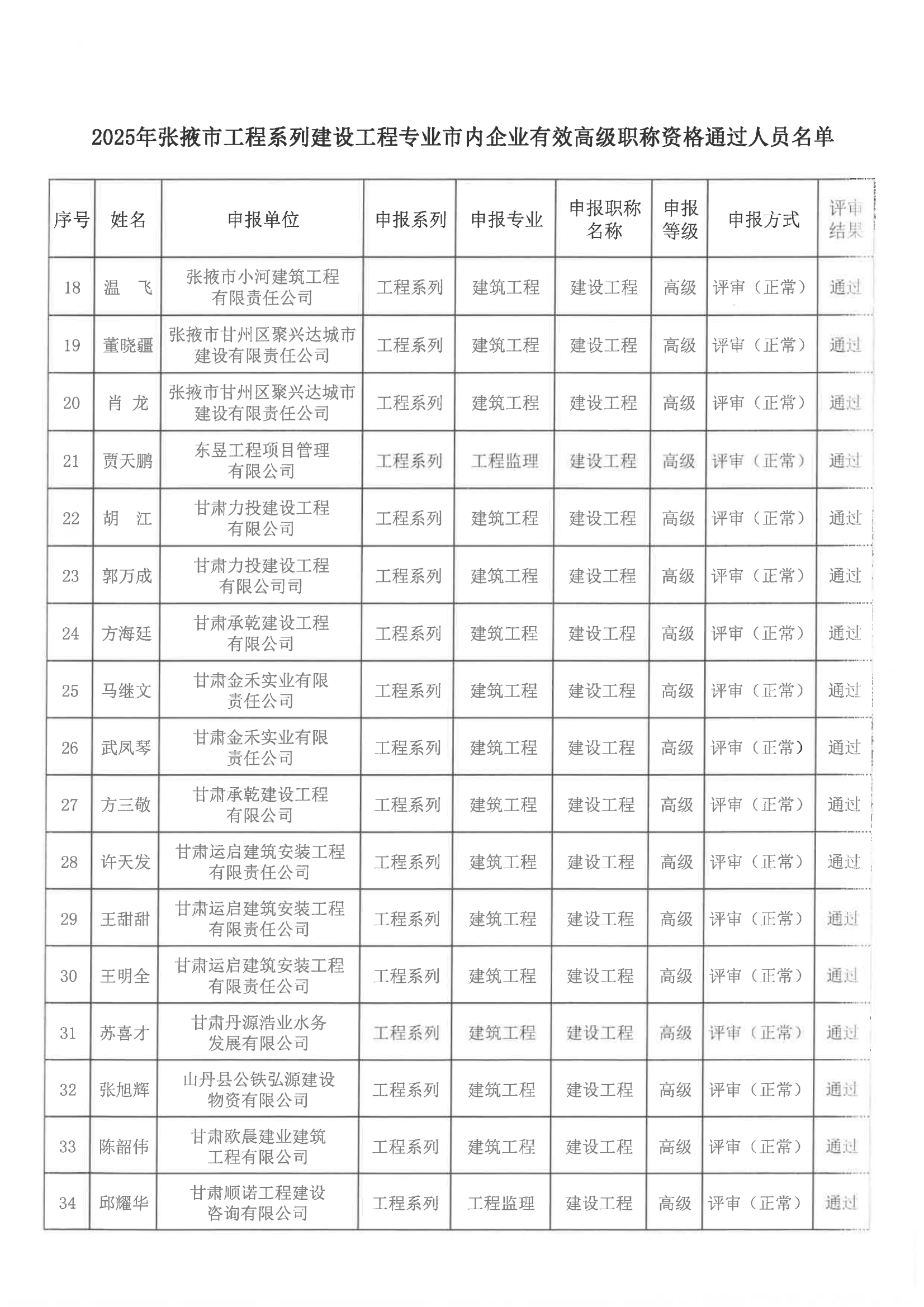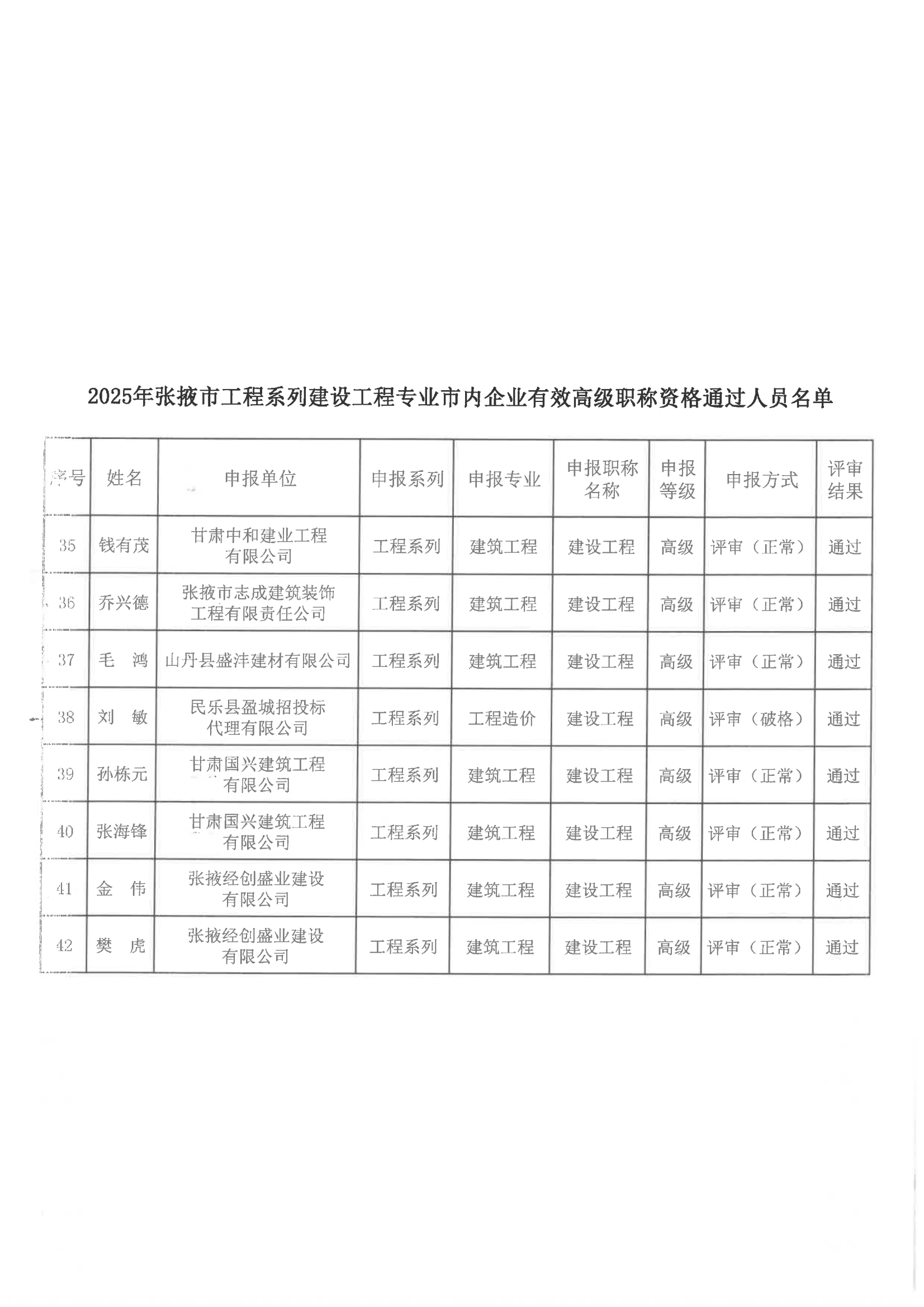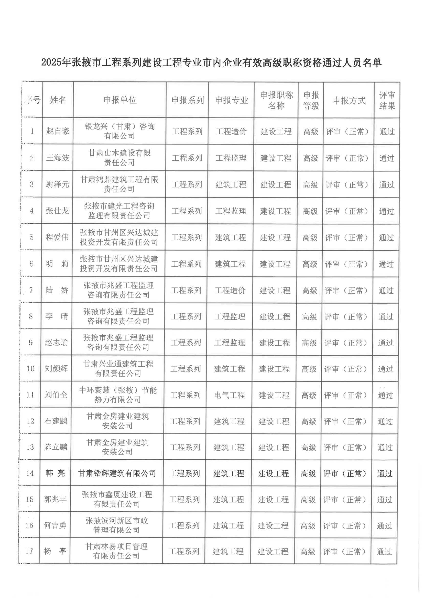 2025年张掖市建设工程专业市内企业有效高级职称评审结果公示