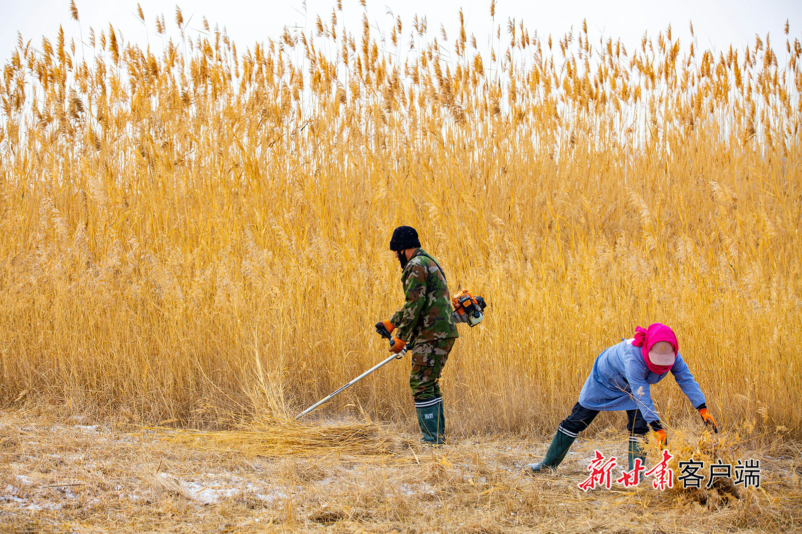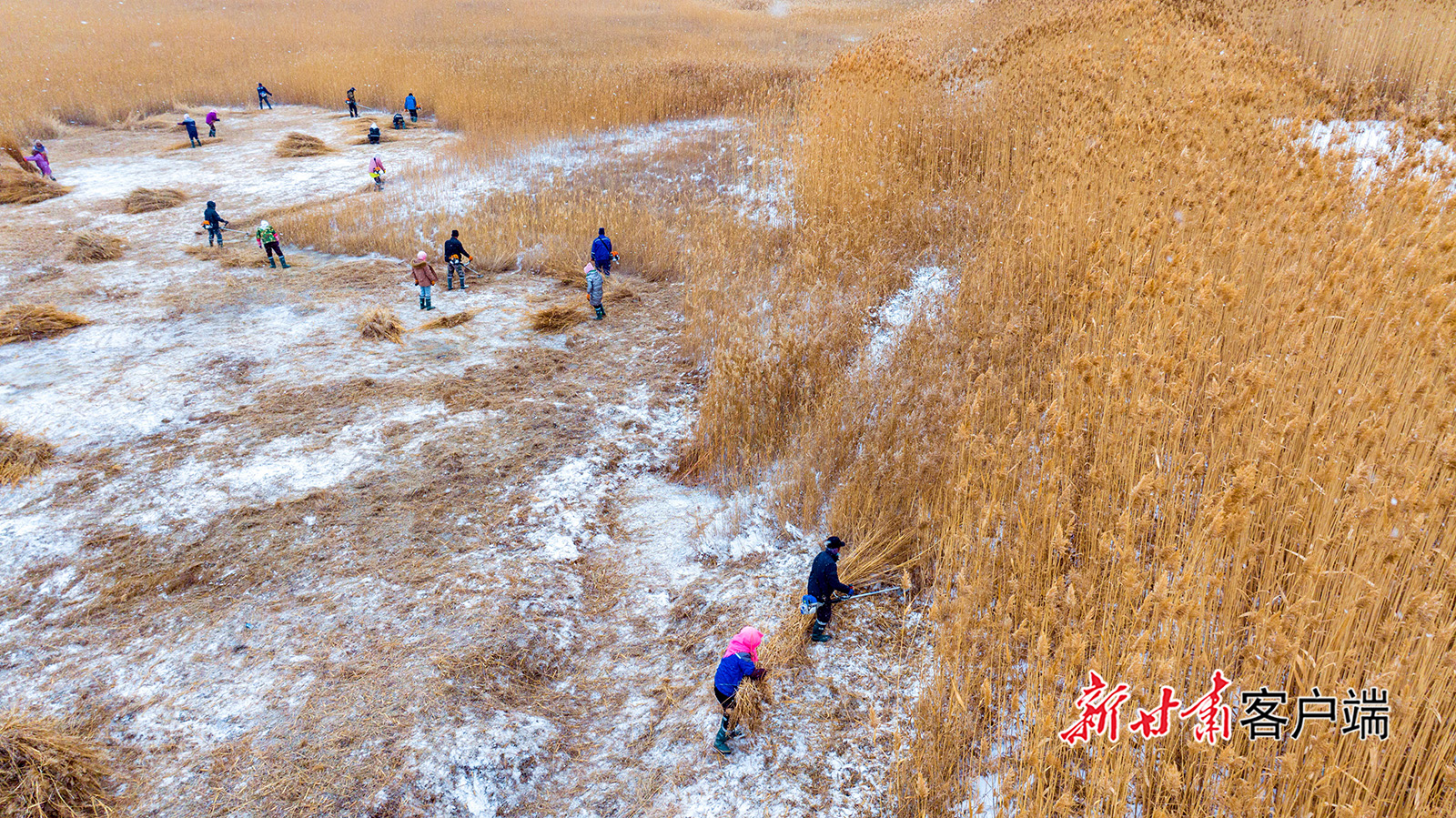 1月2日,张掖国家湿地公园的芦苇荡里,工人正在风雪中收割、打捆芦苇。隆冬时节,张掖湿地管理部门将近3万亩湿地芦苇分区域招标承包,加快芦苇收割进度。收割的大量芦苇提供养殖小区或治沙站,助力生态养殖和治沙,提高了苇草利用率。