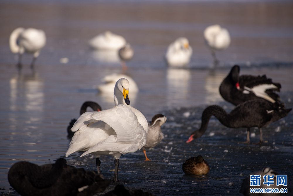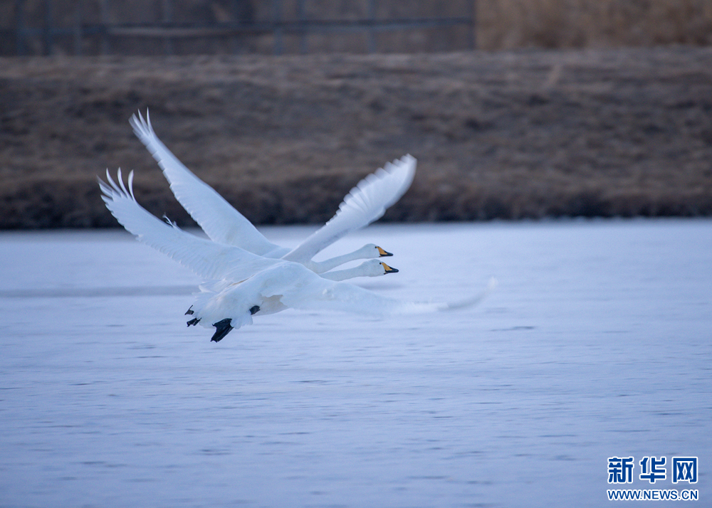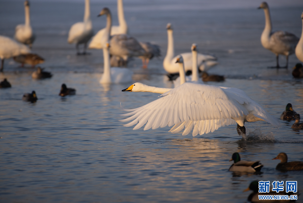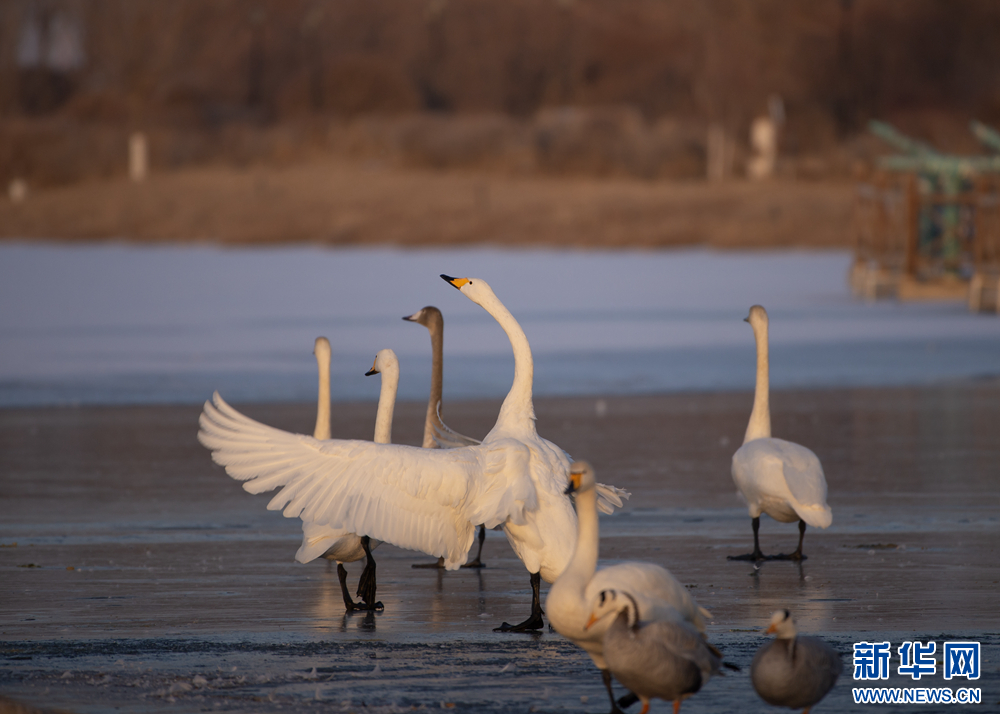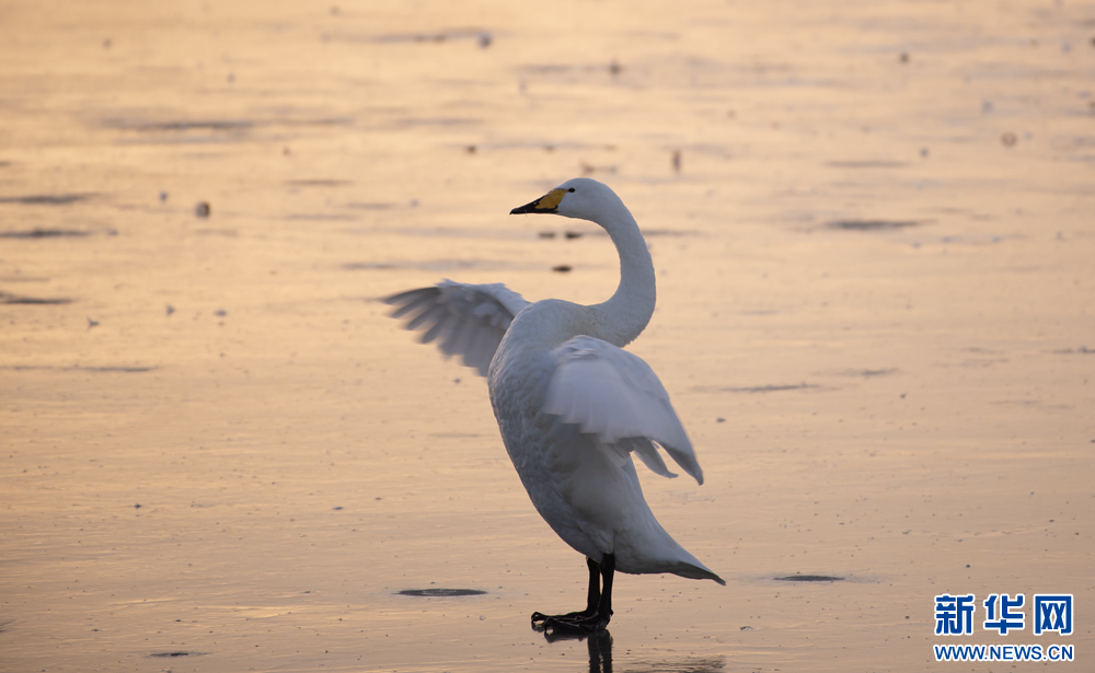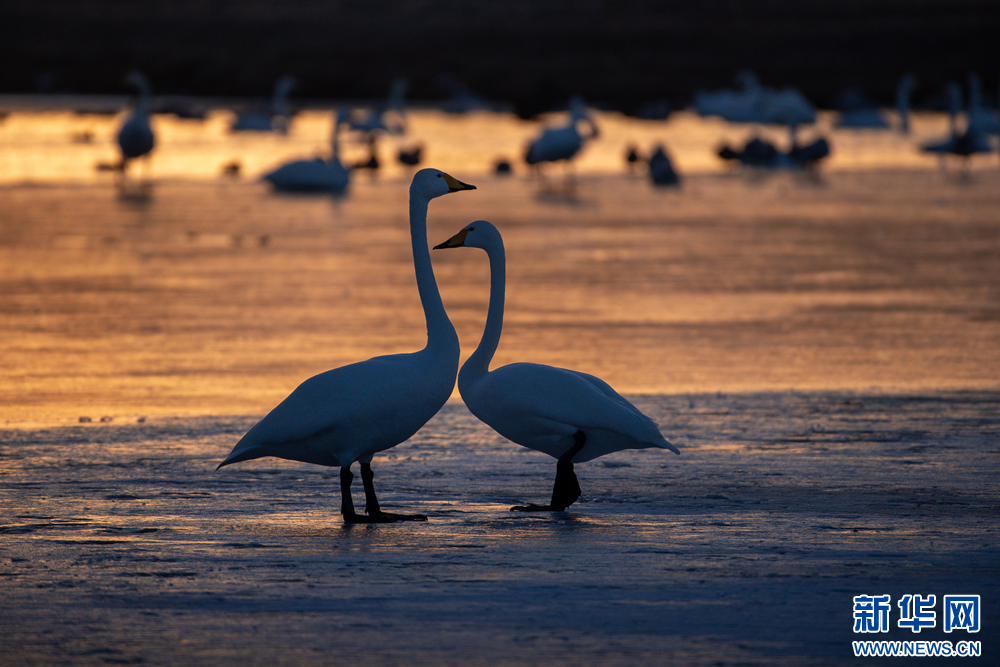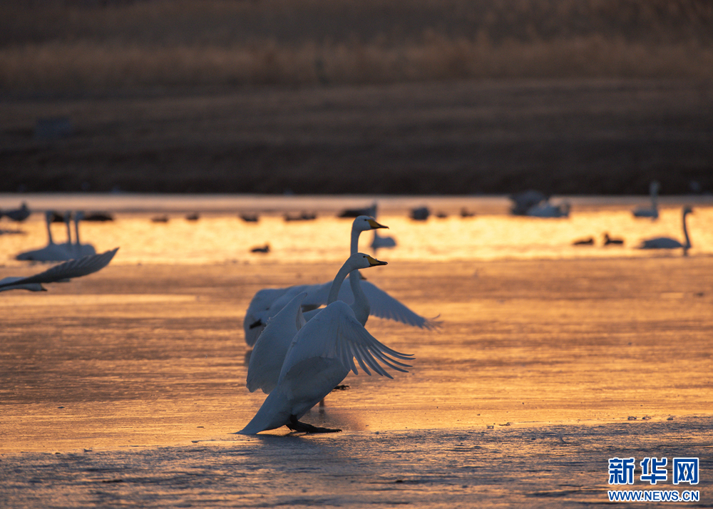冬日的白天鹅在甘肃张掖国家湿地公园的夕阳下翩翩起舞,此起彼伏的鸣唱,柔美的身姿,在阳光里揉成一幅金色画卷。新华网发(刘旭明 摄)