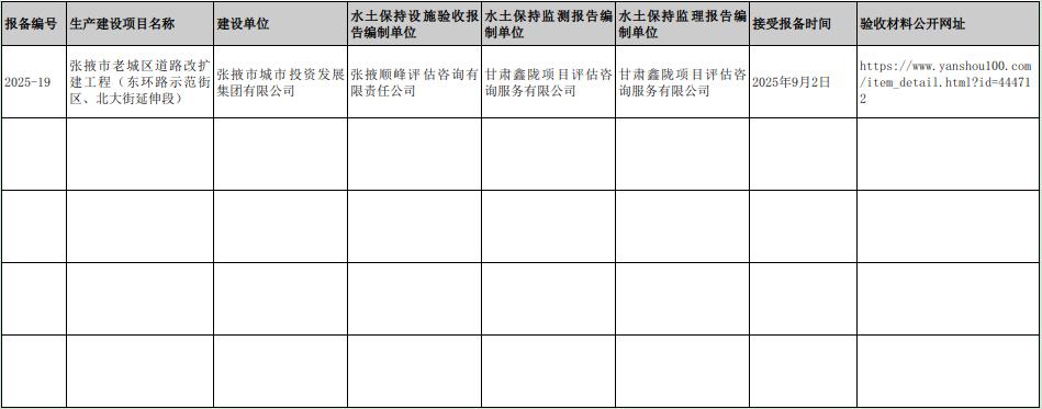 根据《国务院关于取消一批行政许可事项的决定》(国发〔2017〕46号)、《水利部关于加强事中事后监管规范生产建设项目水土保持设施自主验收的通知》(水保〔2017〕365号)、甘肃省水利厅关于《加强事中事后监管规范生产建设项目水土保持设施自主验收实施意见》(甘水水保发〔2017〕 381号)的有关规定,现就2025年9月我局接受的生产建设项目水土保持设施自主验收报备有关情况予以公告。