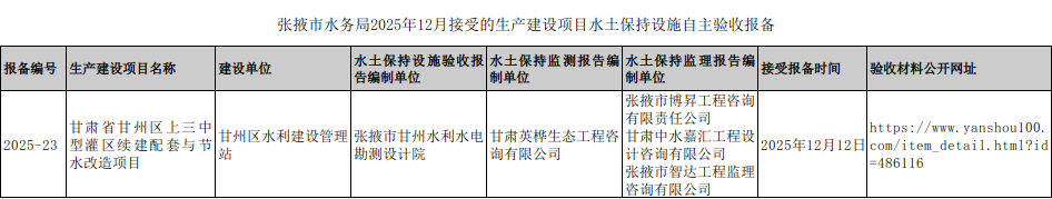 根据《国务院关于取消一批行政许可事项的决定》(国发〔2017〕46号)、《水利部关于加强事中事后监管规范生产建设项目水土保持设施自主验收的通知(水保〔2017〕365号)、甘肃省水利厅关于《加强事中事后监管规范生产建设项目水土保持设施自主验收实施意见》(甘水水保发〔2017〕 381号)的有关规定,现就2025年12月我局接受的生产建设项目水土保持设施自主验收报备有关情况予以公告。