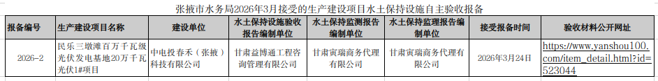 根据《国务院关于取消一批行政许可事项的决定》(国发〔2017〕46号)、《水利部关于加强事中事后监管规范生产建设项目水土保持设施自主验收的通知(水保〔2017〕365号)、甘肃省水利厅关于《加强事中事后监管规范生产建设项目水土保持设施自主验收实施意见》(甘水水保发〔2017〕381号)的有关规定,现就2026年1月我局接受的生产建设项目水土保持设施自主验收报备有关情况予以公告。