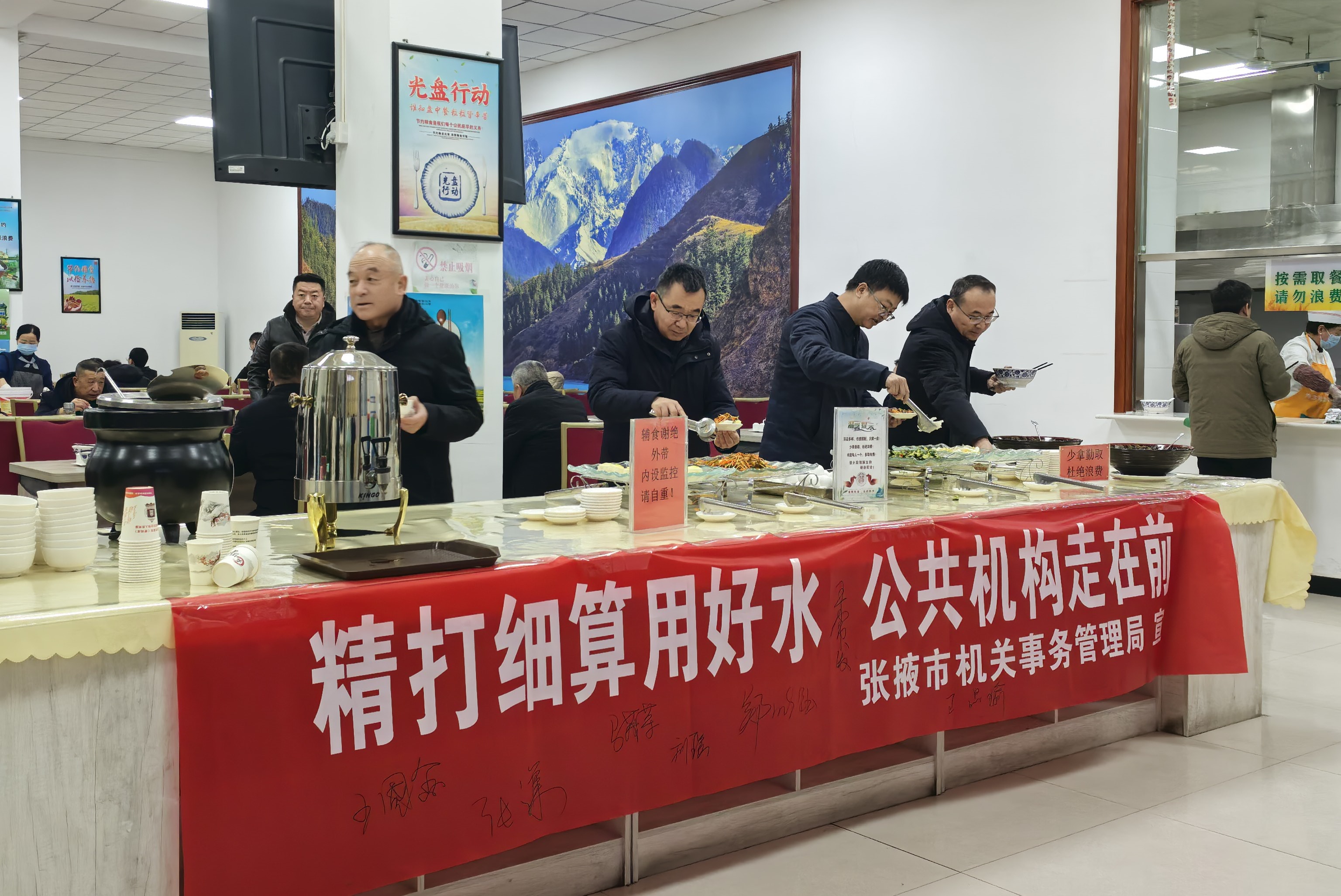 线下阵地营造浓厚氛围。活动充分利用各公共机构办公区域的宣传栏、电子显示屏等实体平台,高频次滚动播放节水主题海报、公益广告与政策法规。全市累计发放节水主题海报4000份、倡议书5000份,确保宣传材料覆盖广泛、触目可及。12月25日上午,我局在市政府机关食堂成功举办了以“精打细算用好水,公共机构走在前”为主题的现场宣传活动,干部职工踊跃在节水承诺横幅上签名,表达了践行节水责任的决心,增强了活动的互动性与感染力。