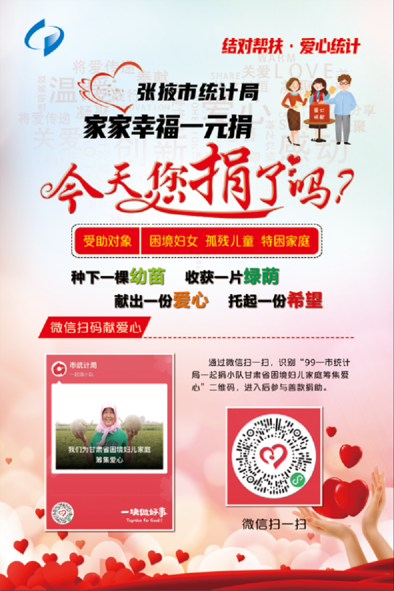 汇聚微光,点亮世界。为深入学习贯彻党的二十大精神,全面落实省委、市委安排部署,张掖市统计局党组高度重视,对“99公益日”活动做出具体安排部署,9月5日上午,组织开展了“家家幸福一元捐”公益募捐活动,倾情助力“爱心张掖”公益项目,有效帮助困境妇女、孤残儿童和困难家庭,得到了全局干部职工的积极支持。