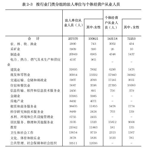 在第二产业和第三产业法人单位从业人员中,位居前三位的行业是:租赁和商务服务业38405人,占14.91%;公共管理、社会保障和社会组织33511人,占13.01%;建筑业31895人,占12.38%。在个体经营户从业人员中,位居前三位的行业是:批发和零售业57940人,占40.48%;住宿和餐饮业27395人,占19.14%;交通运输、仓储和邮政业17241人,占12.05%(详见表2-3)。
