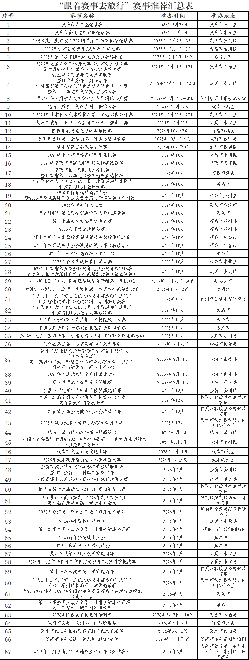 近日,省体育局和省文旅厅联合发布了“跟着赛事去旅行”2025全省精品赛事目录(第二批),我市谋划的张掖市大白毽邀请赛、张掖市全民健身排球邀请赛、2025年全国妇女广场舞大赛(甘肃站)选拔赛暨甘肃省优秀广场舞队伍交流展示赛、民乐县第三届“冰雪嘉年华”系列活动、“第十二届全国大众冰雪季”甘肃省启动仪式(张掖分会场)暨“巩固和扩大‘带动三亿人参与冰雪运动’成果”甘肃省高山滑雪系列赛 (山丹站)、2026年“庆元旦”全民健康徒步走、高台县“体彩杯”元旦环城赛、“中国体育彩票”甘肃省2026年“新年登高”全民健身主题活动(张掖市主会场)等8项赛事活动成功入选,占总数的11.94%,在全省排名第三。(田金顺)