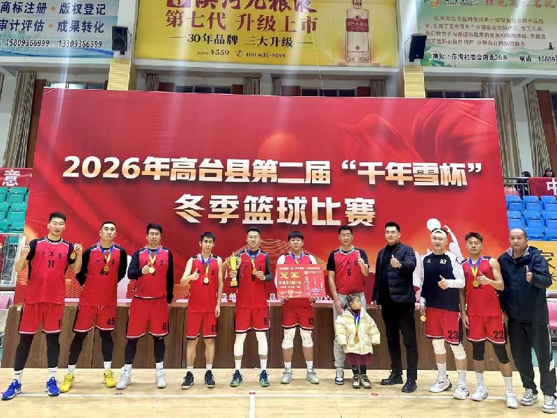 2月5日,由高台县体育运动中心主办,甘肃千年九酿酒业有限公司赞助冠名的2026年高台县第二届“千年雪杯”冬季篮球比赛在县体育馆圆满落幕。本次比赛为期9天(1月28日至2月5日),吸引了全县各单位、企业、返乡大学生等多名篮球爱好者组成的8支队伍参赛。经过多轮角逐,最终千年酒业队勇夺冠军,星锐队获得亚军,风暴队获得季军。
