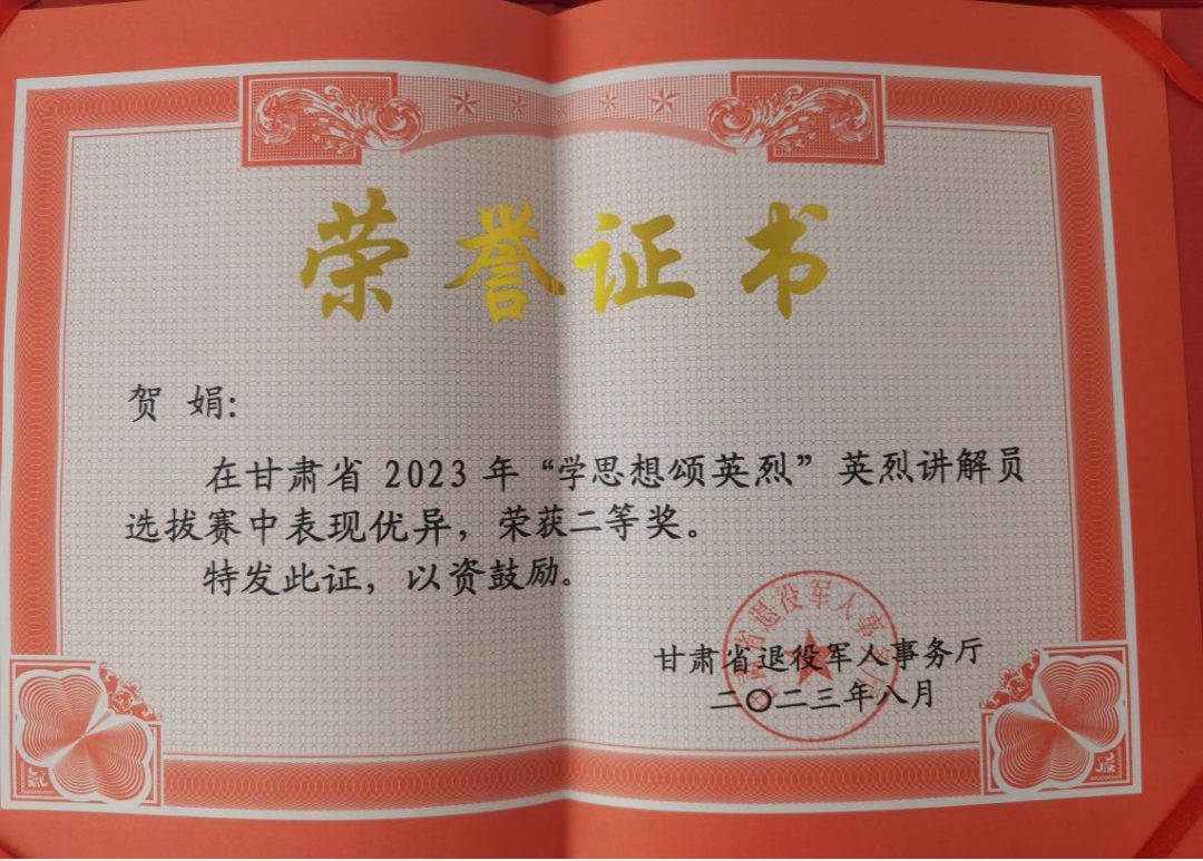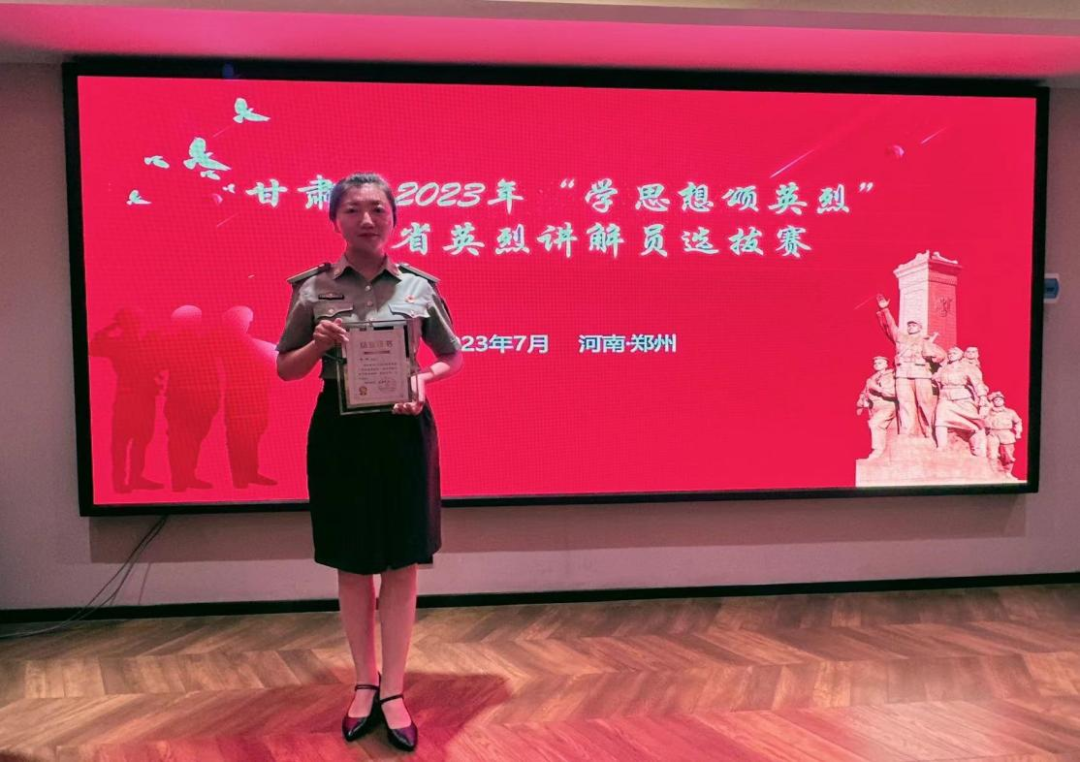 近日,由甘肃省退役军人事务厅举办的“学思想颂英烈”英烈讲解员选拔赛在河南省郑州市圆满落幕,来自全省13个地州市退役军人事务局选送的30多名优秀选手参加了此次比赛。由肃南县退役军人事务局选送的讲解员贺娟,通过即兴讲解、才艺展示、知识测评、综合考评等相关环节的角逐,最终以生动的语言和优秀的表现赢得了专家评委的一致认可,获得全省二等奖佳绩。