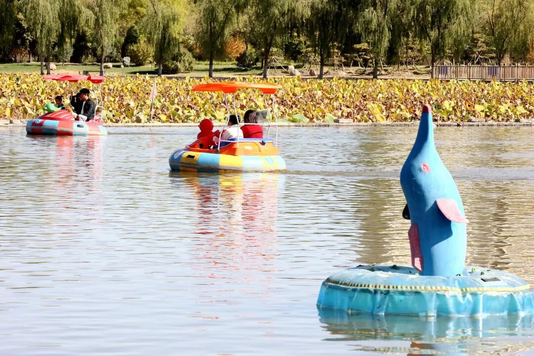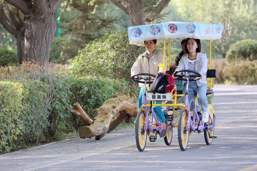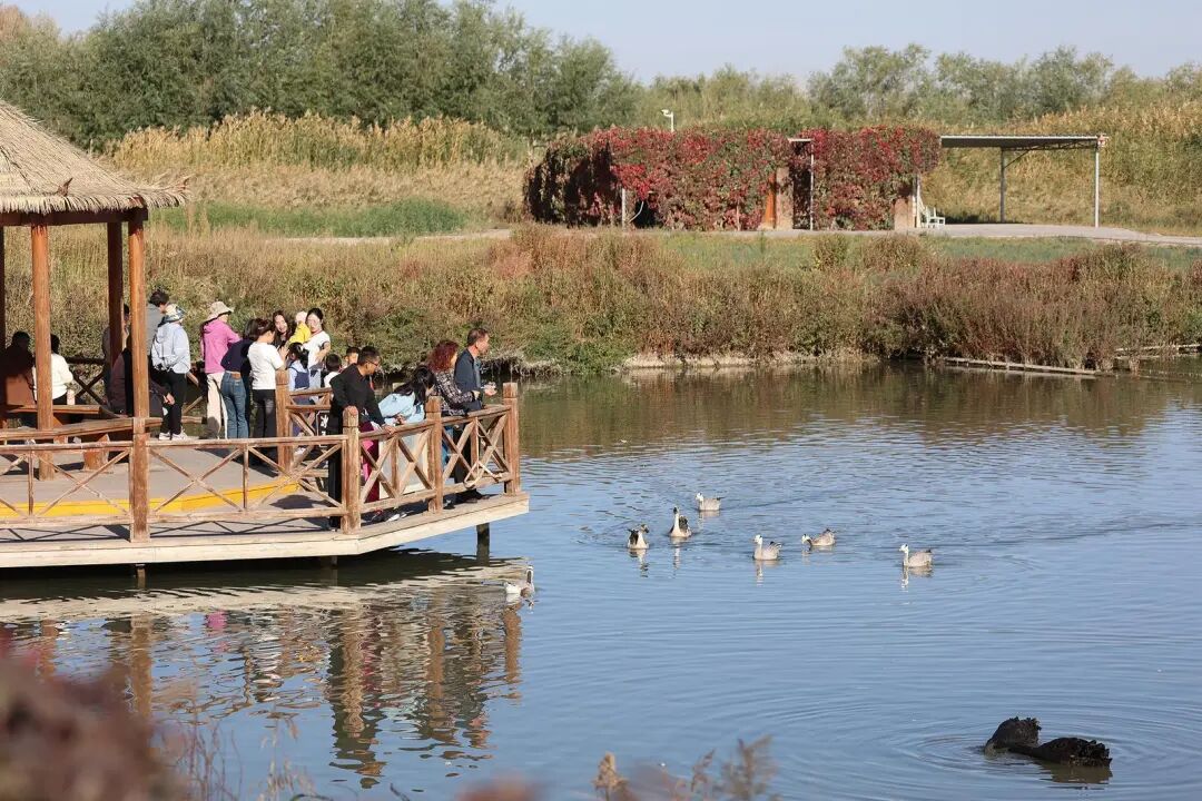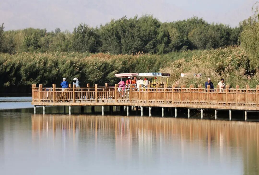张掖国家湿地公园内,清澈的湖水倒映着蓝天白云,葱郁的树木点缀其间,成群的天鹅悠然游弋,吸引了大量游客驻足观赏。作为丝绸之路上的“绿色明珠”,这片国家级湿地不仅是张掖生态保护的标志性成果,更成为双节期间市民休闲度假的热门选择。景区推出的自行车骑行、观光车游览等多种游乐项目,进一步丰富了游客体验,让人们在亲近自然中感受假日的惬意。