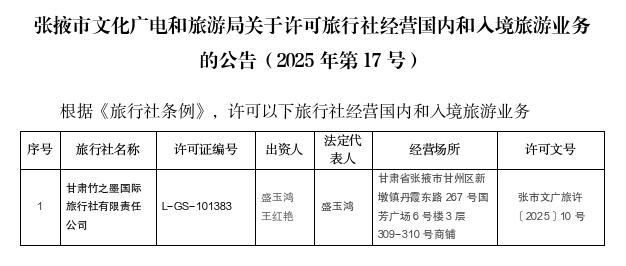 张掖市文化广电和旅游局关于许可旅行社经营国内和入境旅游业务的公告(2025年第17号)