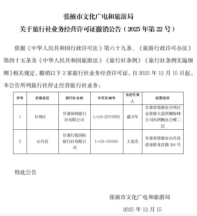 张掖市文化广电和旅游局关于旅行社业务经营许可证撤销公告(2025年第22号)
