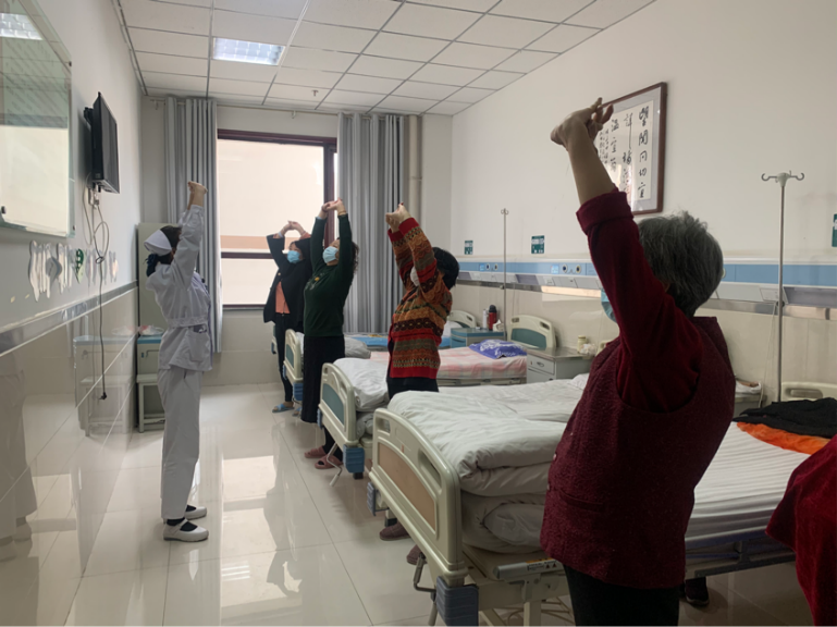 三是根据新冠肺炎疫情防控要求,患者及陪护人员在住院期间闭环管理,容易出现焦虑情绪影响患者康复。每天下午四点由责任护士带领病区患者及家属打太极拳、做八段锦及糖尿病健身操,为患者宣讲穴位按摩、经络拍打等养生保健知识,充分发挥中医药的独特优势,丰富患者住院期间的生活,助力患者调畅情志。
