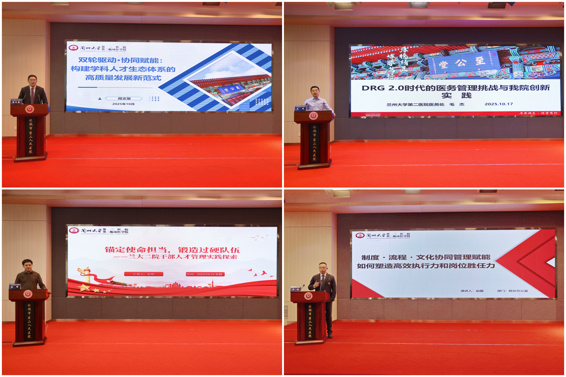 开幕式结束后,兰大二院党委副书记、院长周文策,医务处处长、普外科主任毛杰,办公室主任赵磊,党委组织统战部副部长张辉四位医疗管理领域专家,分别围绕学科人才生态体系构建、DRG 2.0时代下的医务管理挑战与应对、高效执行力与岗位胜任力塑造、干部人才管理等核心议题进行了系统讲解与经验分享。专家们的讲解深入浅出,案例丰富,在紧密结合当前医疗机构管理实际的同时,兼顾理论深度与应用广度,既阐释了管理逻辑的底层原理,又提供了可复制的操作方法,为参训人员提供了宝贵的理论指导和实践参考。