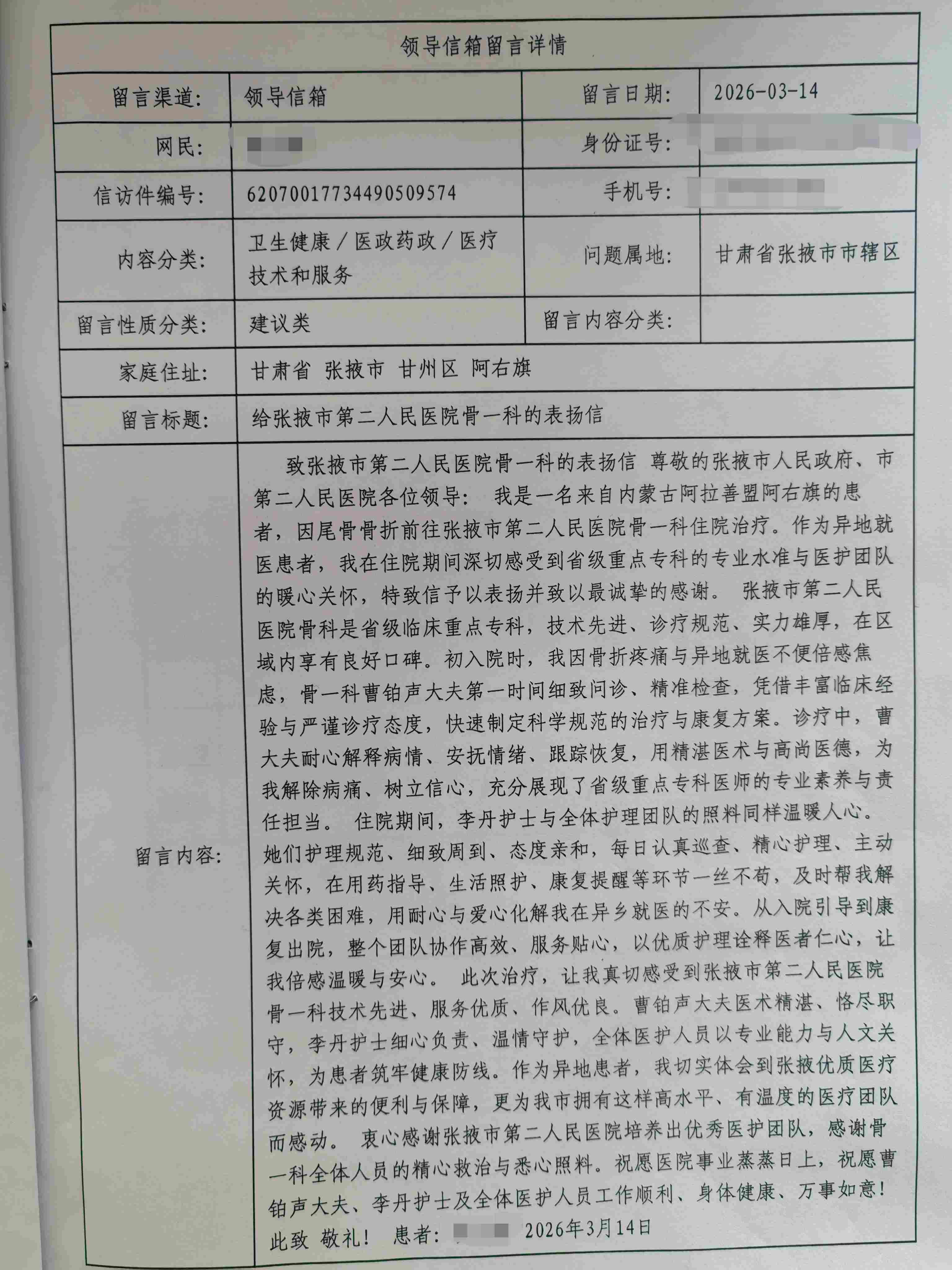 近日,一封承载着满满感激之情的表扬信,跨越甘蒙两地数百公里的距离,从内蒙古阿拉善盟阿右旗发送到张掖市第二人民医院,字里行间满含着患者对骨一科全体医护人员精湛医术的由衷敬佩和暖心服务的深深致谢,为春日里的医院增添了一抹温情,也彰显了医患同心的动人力量。