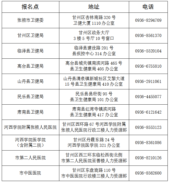 张掖考点下设市卫生健康委、甘州区、临泽县、高台县、山丹县、民乐县、肃南县卫生健康局及河西学院附属张掖人民医院、河西学院医学院、市第二人民医院、市中医医院等11个报名点。各报名点具体负责考试报名现场确认、相关证明材料收集上报等工作。市直医疗卫生单位、市直教育系统的报名工作由市卫生健康委负责,河西学院卫生专业技术人员报名工作由河西学院附属张掖人民医院、河西学院医学院按照管理权限分别负责,其他考生报名由各县区根据辖区范围分别负责,民营医疗机构报名由所在地报名点负责。