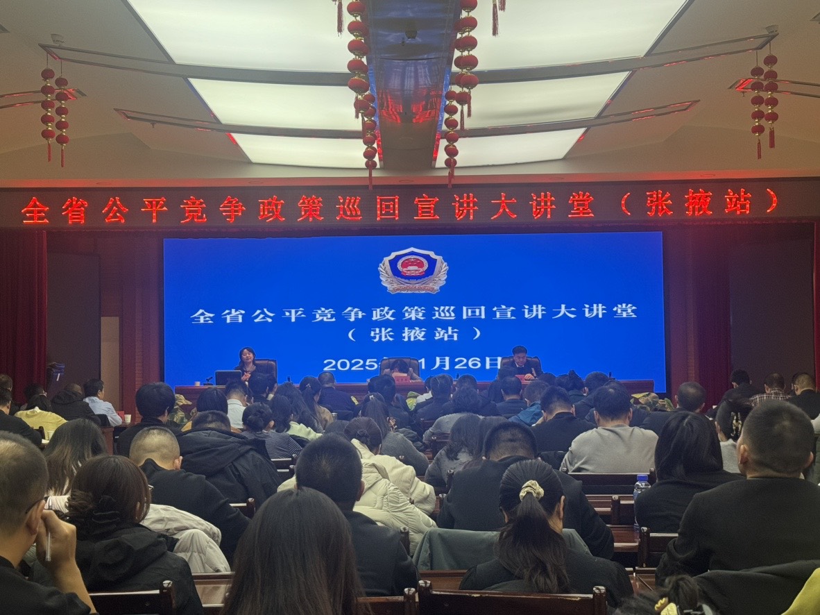为深入贯彻党中央、国务院关于构建全国统一大市场的决策部署,培育竞争理念,弘扬竞争文化,11月26日,全省公平竞争政策巡回宣讲活动在张掖市举行。市、区有关部门负责公平竞争审查工作的分管领导和联络员,全市市场监管系统负责公平竞争审查工作的分管领导和科室人员共200余人参加宣讲报告会。