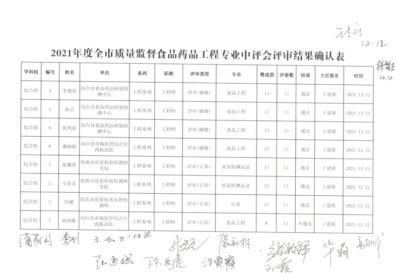 经张掖市质量监督食品药品工程专业中级职称资格评审委员会2021年12月12日评审通过,马菲菲等7名同志具备全省有效工程师职称资格,现予以公示,并接受广大群众监督。